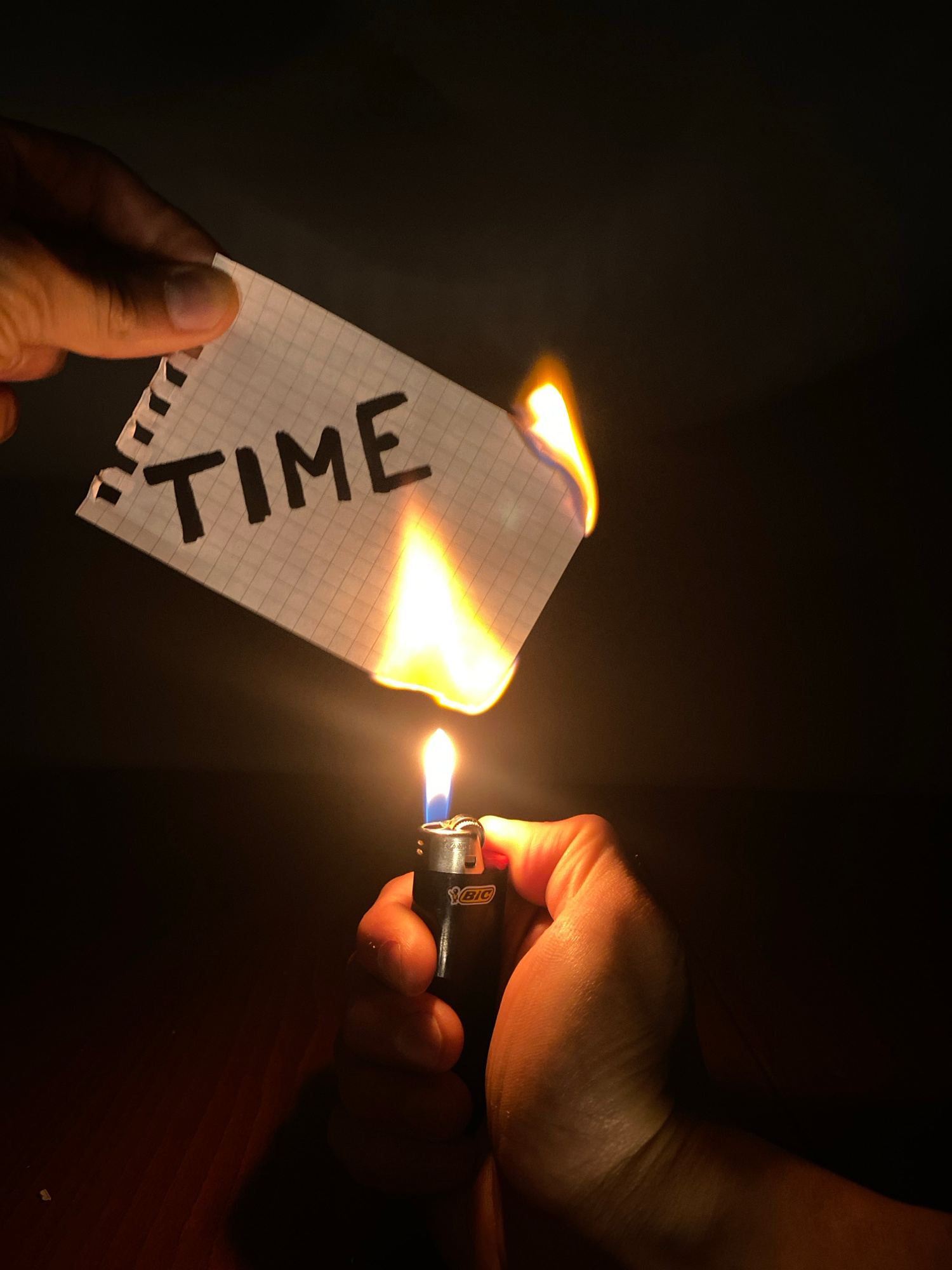 A photograph shows a person holding a piece of graph paper with the word "TIME" written on it, while another person uses a lighter to set the paper on fire. The background is dark and indistinct, with…read more
