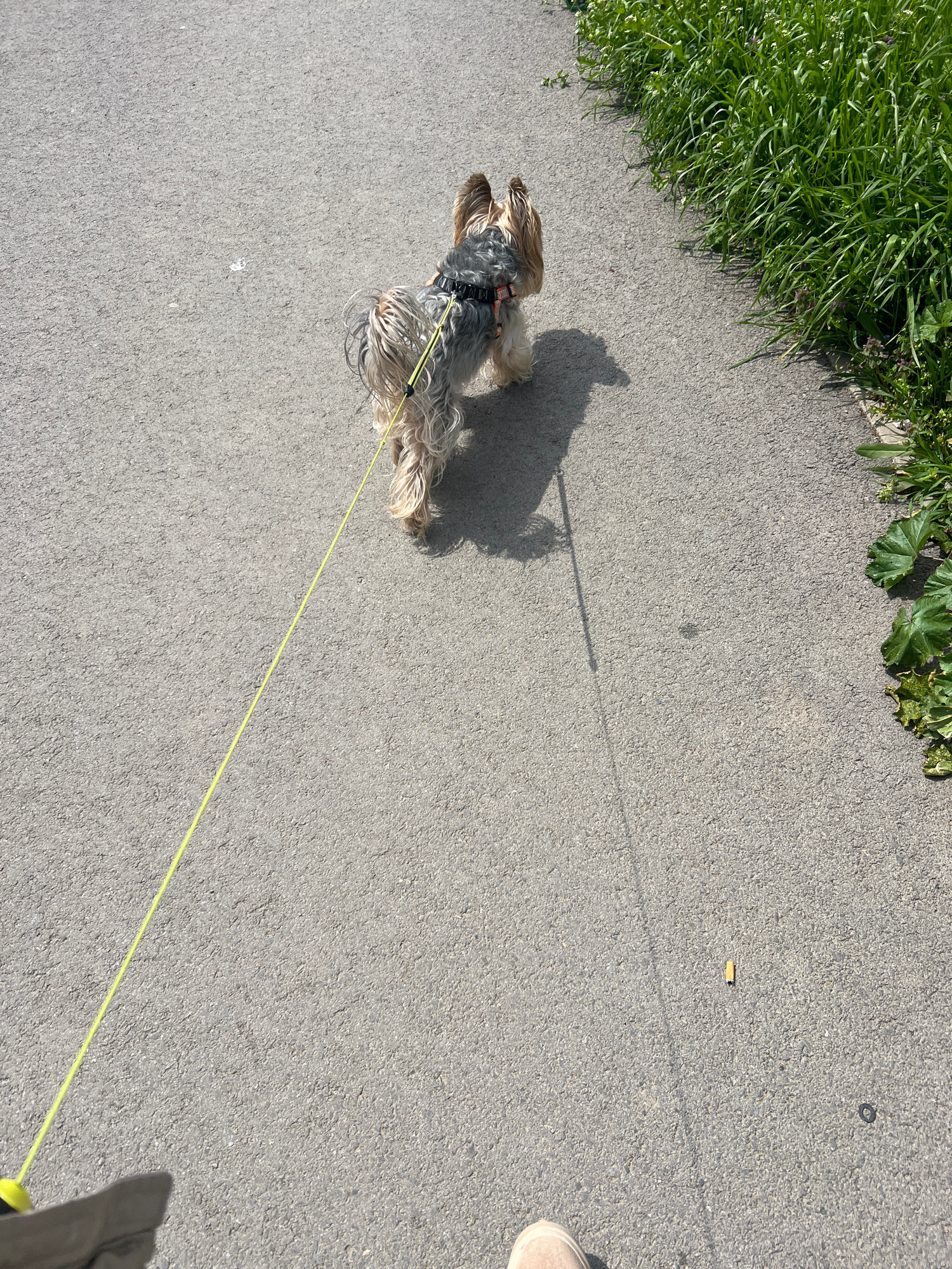 The scene is an outdoor setting in daylight, likely on a paved path or sidewalk. At the top left corner of the image, there is a patch of green grass and other green plants, indicating a roadside or p…read more