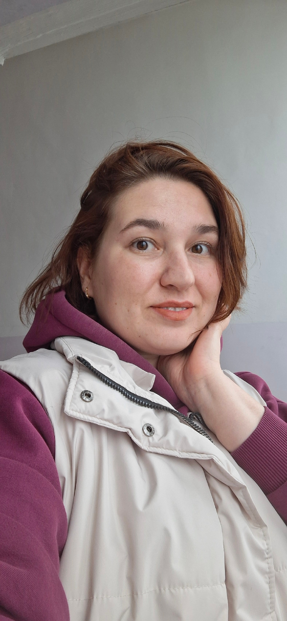 A woman with brown hair and fair skin is posing for a selfie indoors. She is wearing a maroon hooded sweatshirt under a light beige sleeveless jacket. She has a slight smile and her right hand is supp…read more