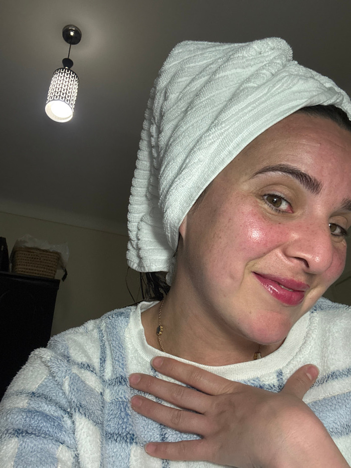 The image features a woman captured from a low-angle, looking upwards, in what appears to be a domestic indoor setting in Meknes, Morocco. Her face, tilted to the side, is the central focus. She has a…read more