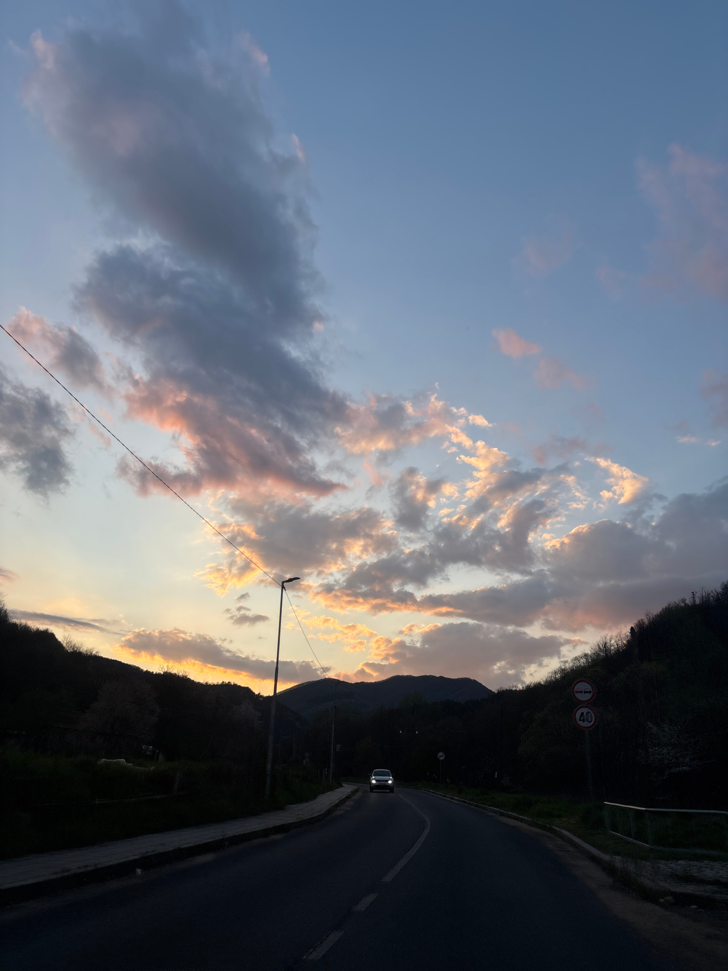 The image depicts a road in Zlatograd, Bulgaria, likely taken during dusk or dawn, based on the lighting conditions. The road curves to the right, and a car is seen with its headlights on. The sky is…read more