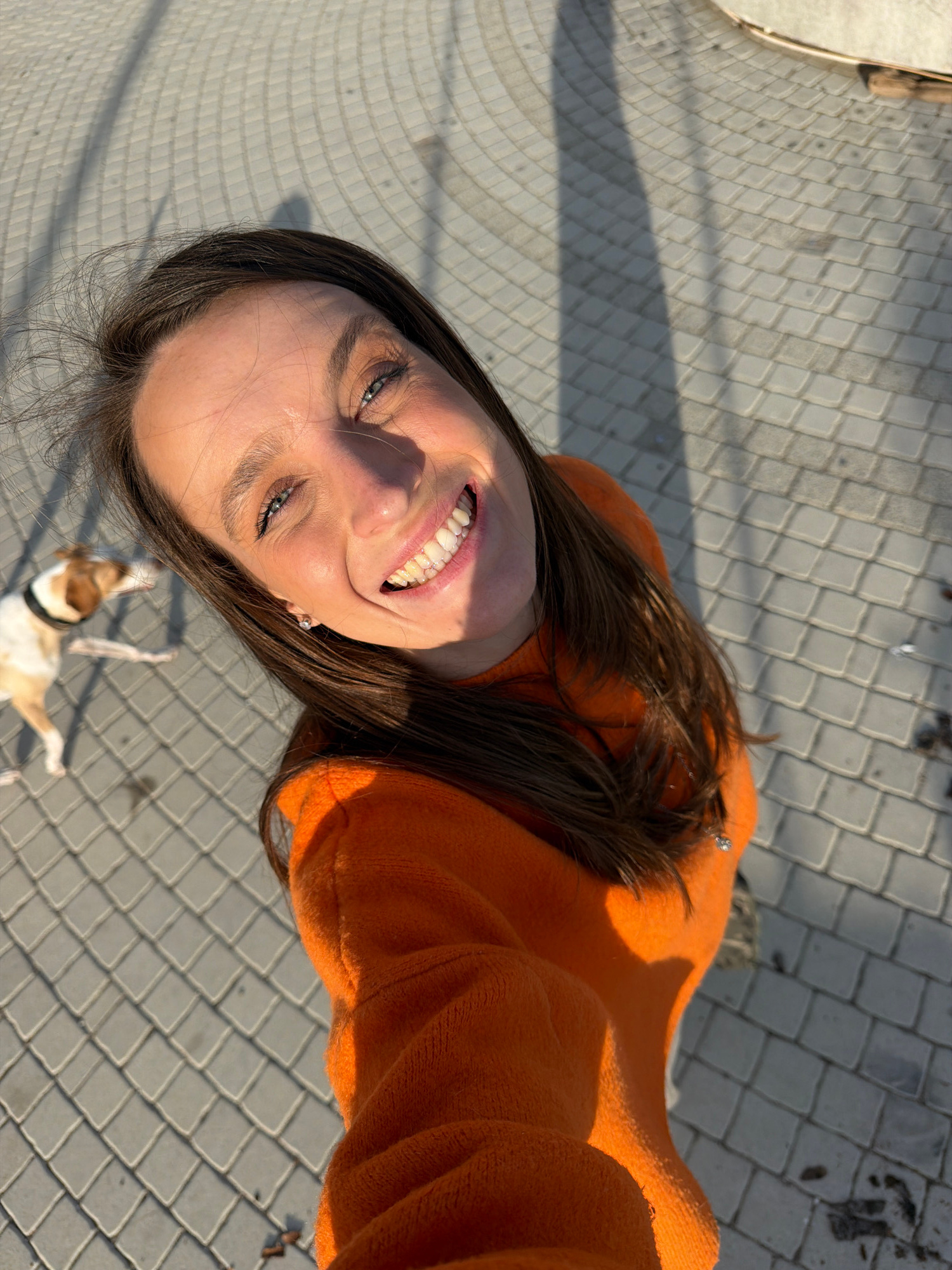 A young woman wearing an orange sweatshirt is taking a selfie, looking up into the camera. Her brown hair is parted and falls around her face. She is smiling broadly, revealing her teeth. Below her, a small dog with brown and white fur and a black collar is visible. The setting appears to be an outdoor paved area. The geometric paving stones are gray and create a grid pattern. In the background, a curved concrete structure can be seen, possibly a wall or a planter. Given the information provided, it can be deduced that the location is Sutomore, Montenegro. | Open Wire
