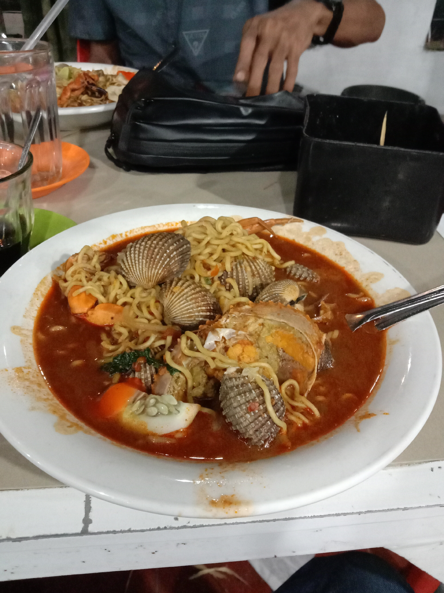 A close-up shot depicts a white plate filled with a dish consisting of noodles, seafood, and a reddish-brown broth, likely a local Indonesian cuisine. The seafood components include several cockles an…read more