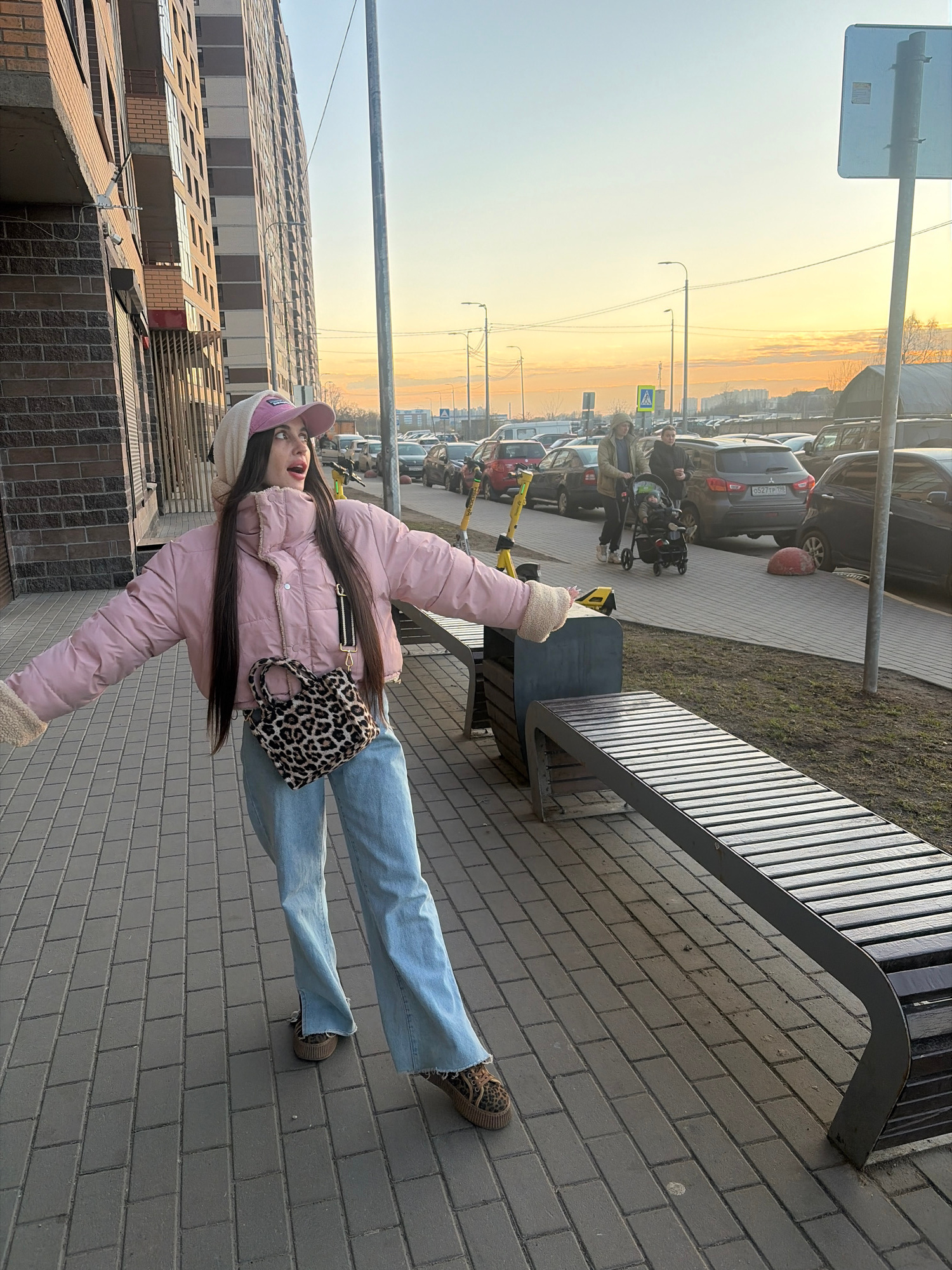 The image captures a woman standing on a sidewalk in what appears to be a city street, likely in Saint Petersburg, Russia. The scene is outdoors, with a clear sky visible in the background. The womanβ¦read more