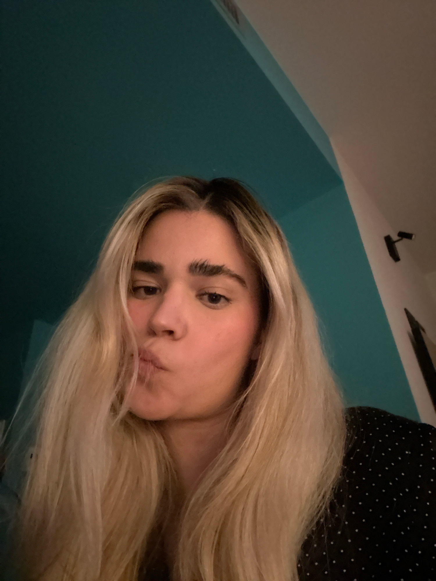 A woman with long blonde hair is lying down, facing the camera. She has light skin, dark eyebrows and is making a kissing face. She is wearing a black and white polka dot garment. Behind her is a teal…read more