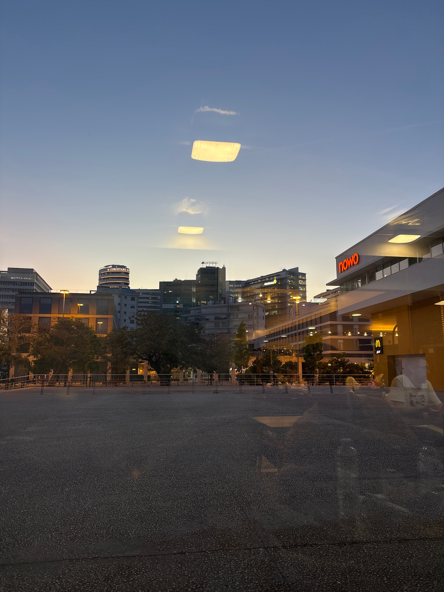 The image depicts a view in Lisbon, Portugal, captured through a glass surface, likely a window. The scene is oriented vertically. The sky is visible at the top left, transitioning from blue to a ligh…read more