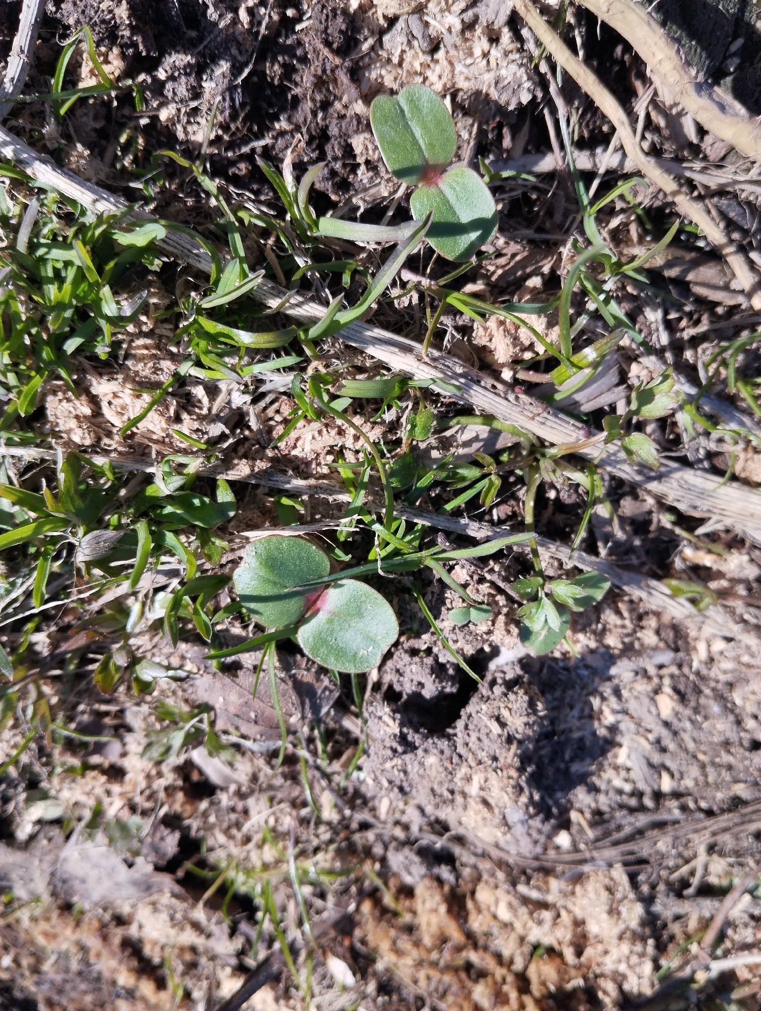 The image shows a close-up view of vegetation and soil. Two sets of seedlings with two rounded leaves each are visible. The cotyledons have a slightly reddish tinge at the base. There is also grass an…read more