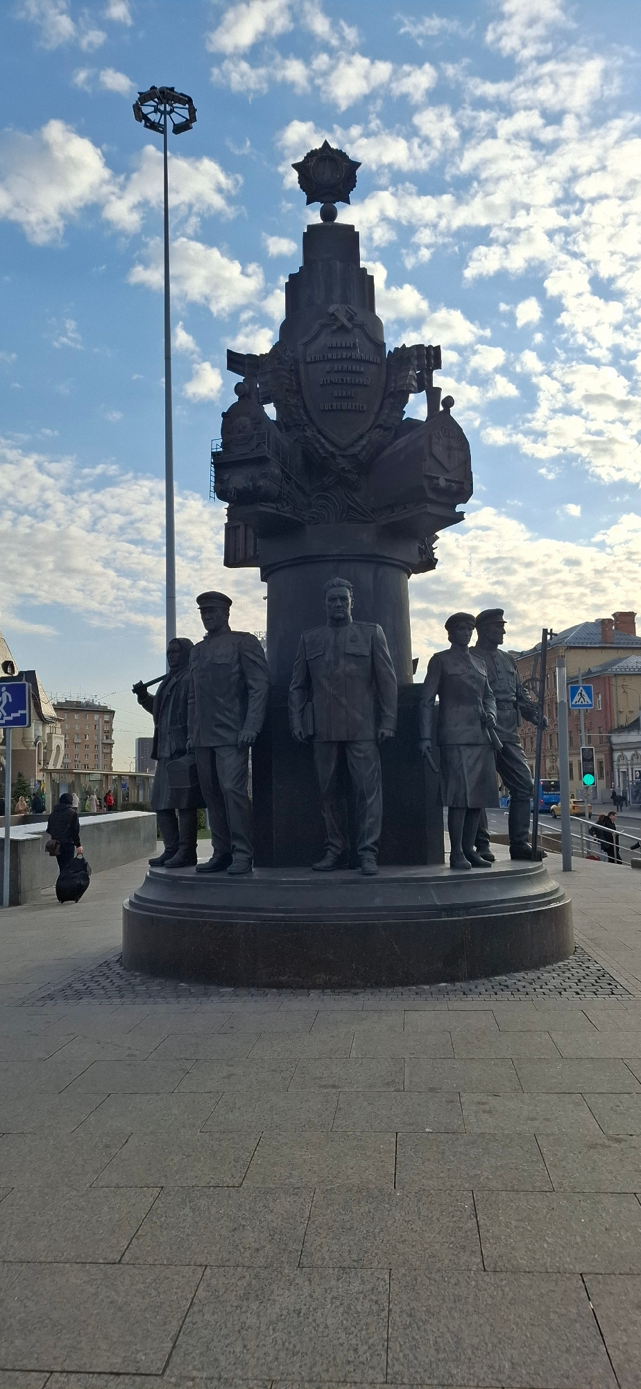Here is a detailed description of the image: **Overview:** The image captures a monument in Moscow, Russia, with a partially cloudy sky in the background. The view appears to be taken at ground leve…read more