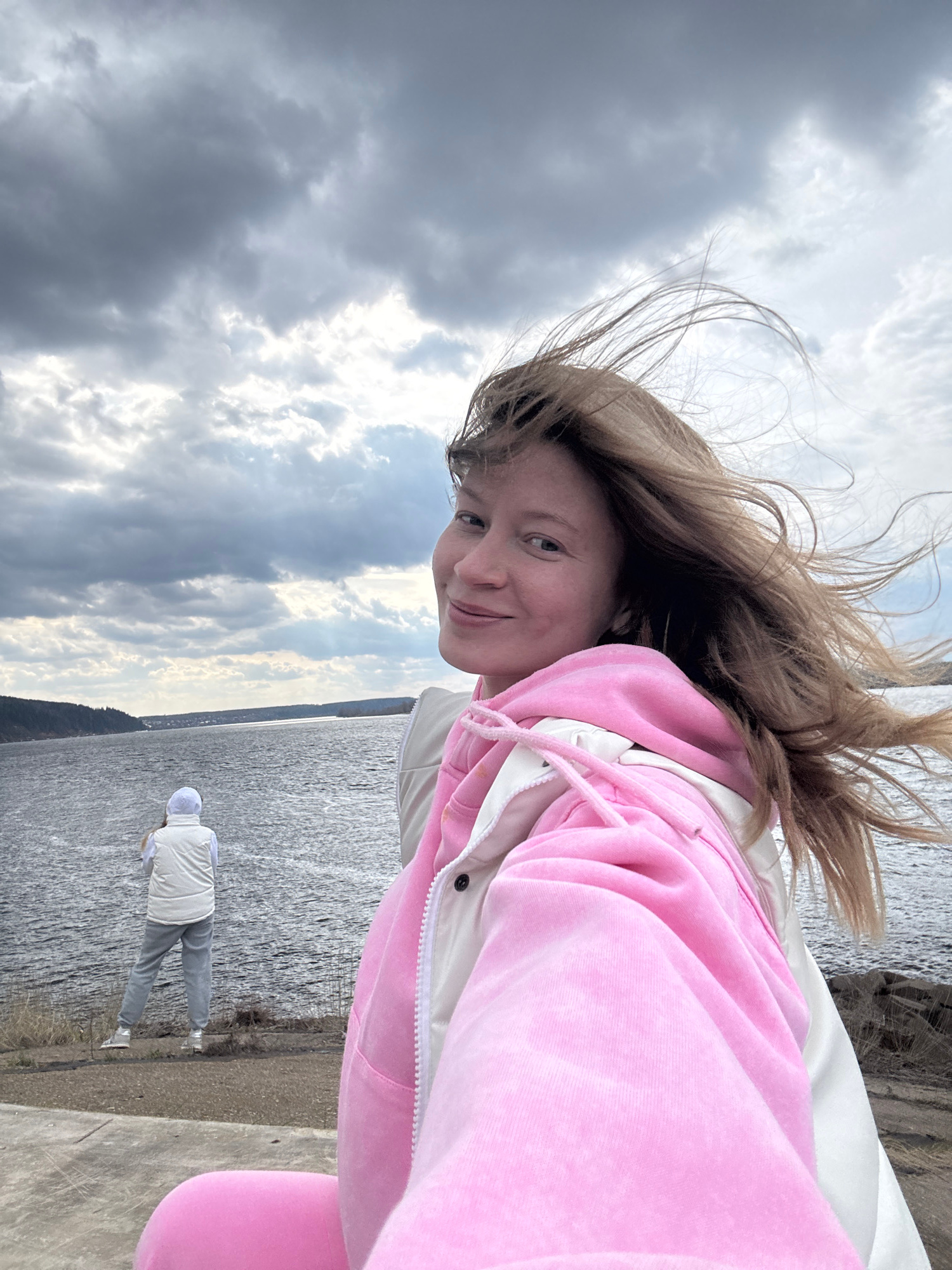 The image captures a dynamic, tilted selfie-style shot of a young person outdoors, with a vast body of water and a cloudy sky in the background. The main subject, a young person with light brown hair,…read more