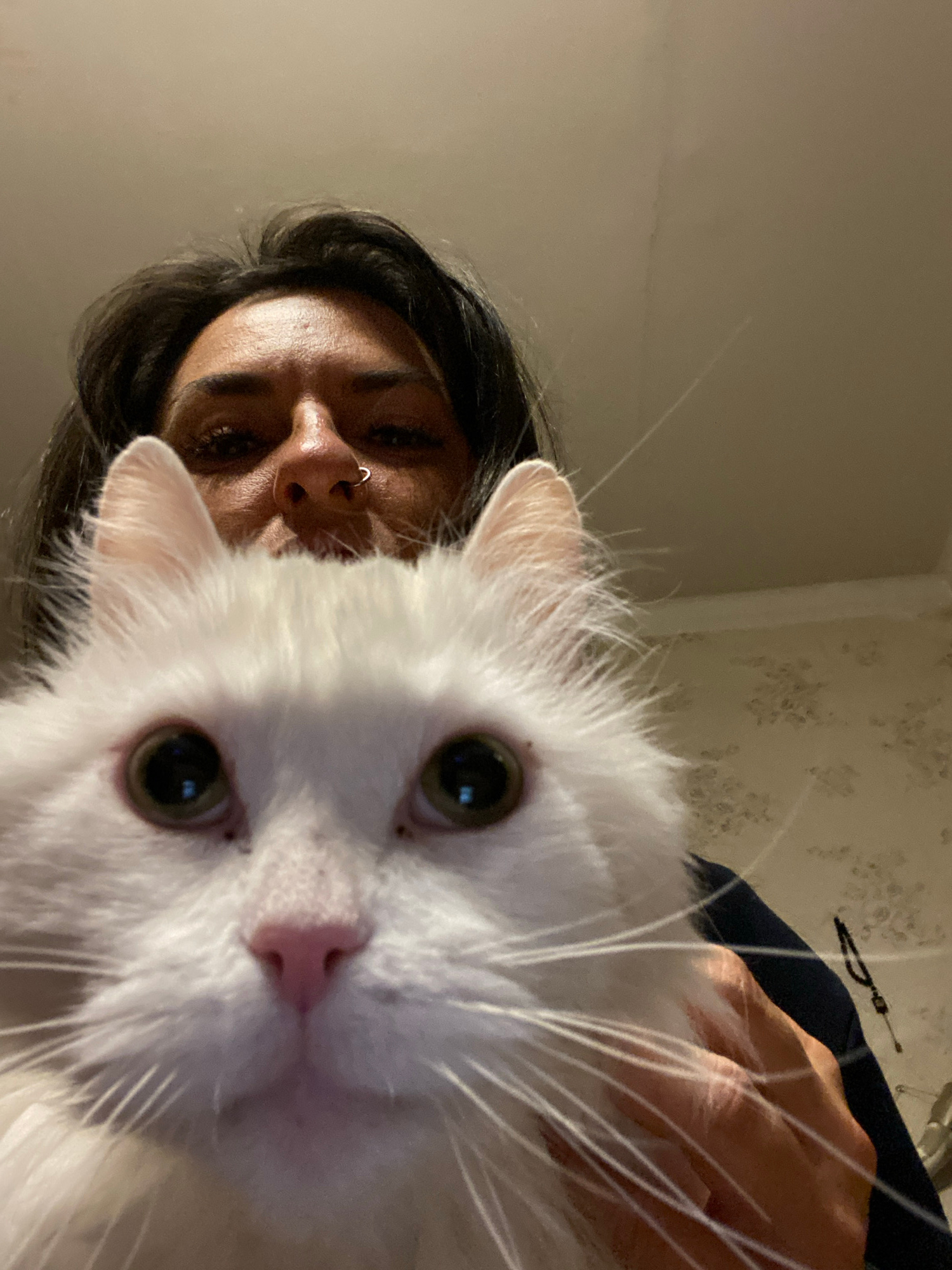A close-up, low-angle shot shows a person and a white cat. The person, partially visible on the left, has dark hair and a nose ring. The cat is prominently displayed, taking up most of the frame, with…read more