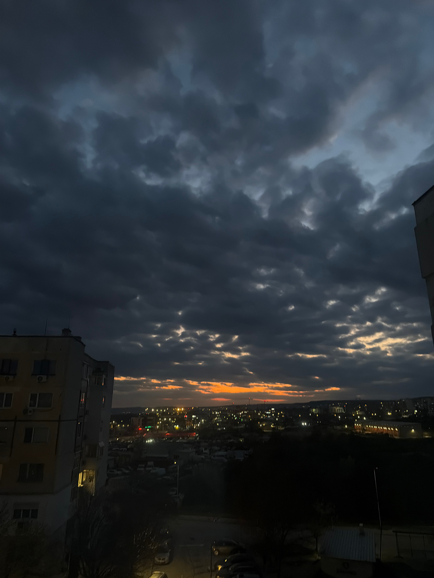 The image, oriented incorrectly as if rotated counter-clockwise, depicts an urban landscape at dusk in Varna, Bulgaria. The dominant feature is the sky, filled with heavy, dark, and turbulent cloud fo…read more