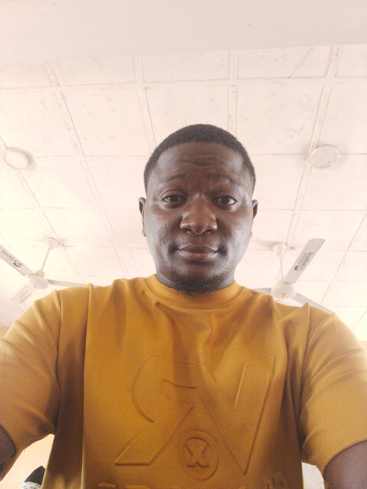A medium shot of a Black man in a yellow t-shirt. The man is facing forward with his head at the top of the frame, with his shirt in the middle, and a ceiling with ceiling fans visible in the backgrou…read more