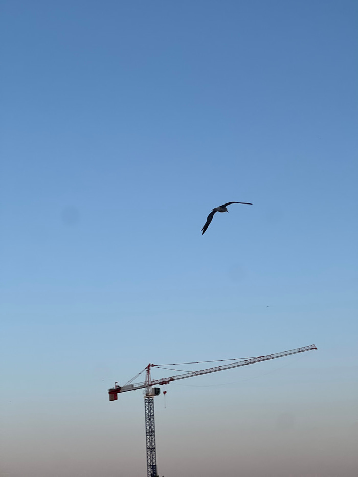 The image depicts an outdoor scene in the city of Tanger, Morocco. A clear sky with a gradient from darker blue at the zenith to a lighter blue towards the bottom dominates the frame. In the upper-mid…read more
