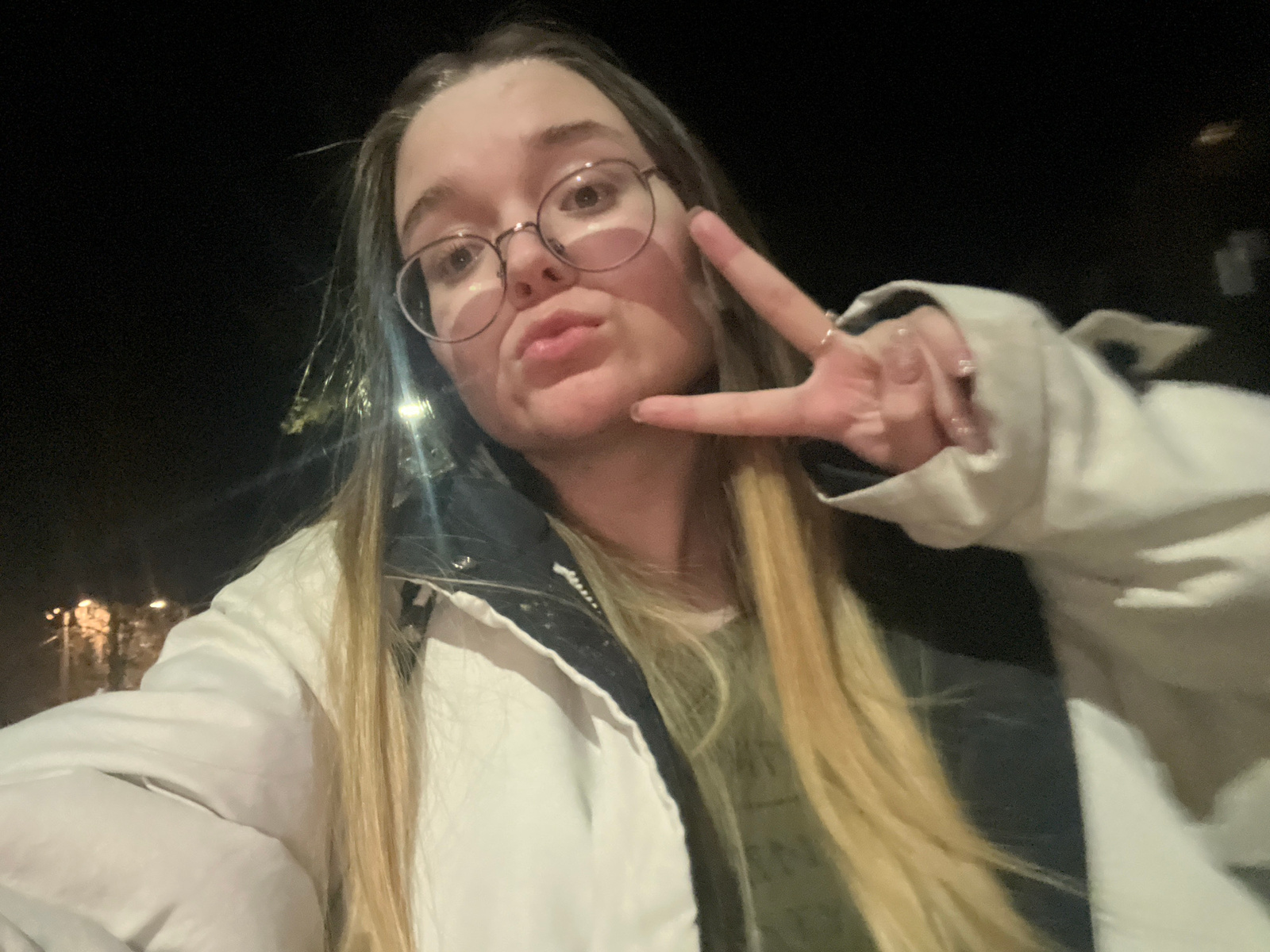 The image displays a close-up, chest-up view of a single female individual, identified as being in the city of Pushchino, Russia, at night. The subject has fair skin, long blonde hair, and wears round…read more
