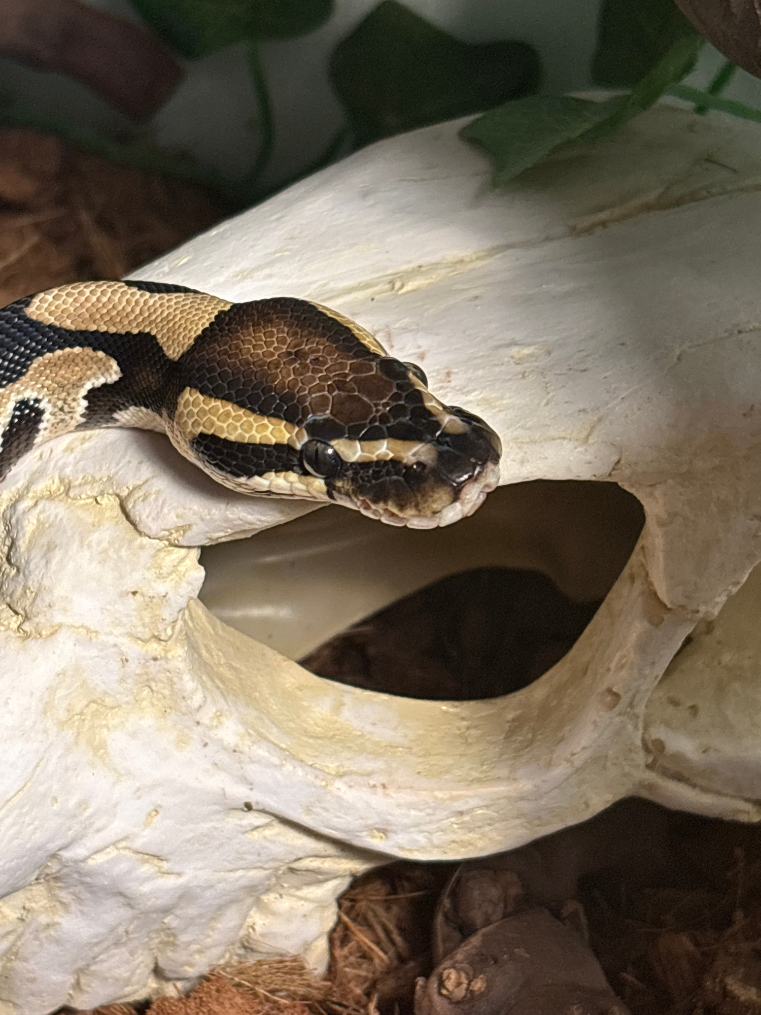 A ball python is positioned in front of a white, skull-shaped object. The snake's head is in the foreground, facing upwards, with its body extending downwards and out of view. The skull has a large op…read more