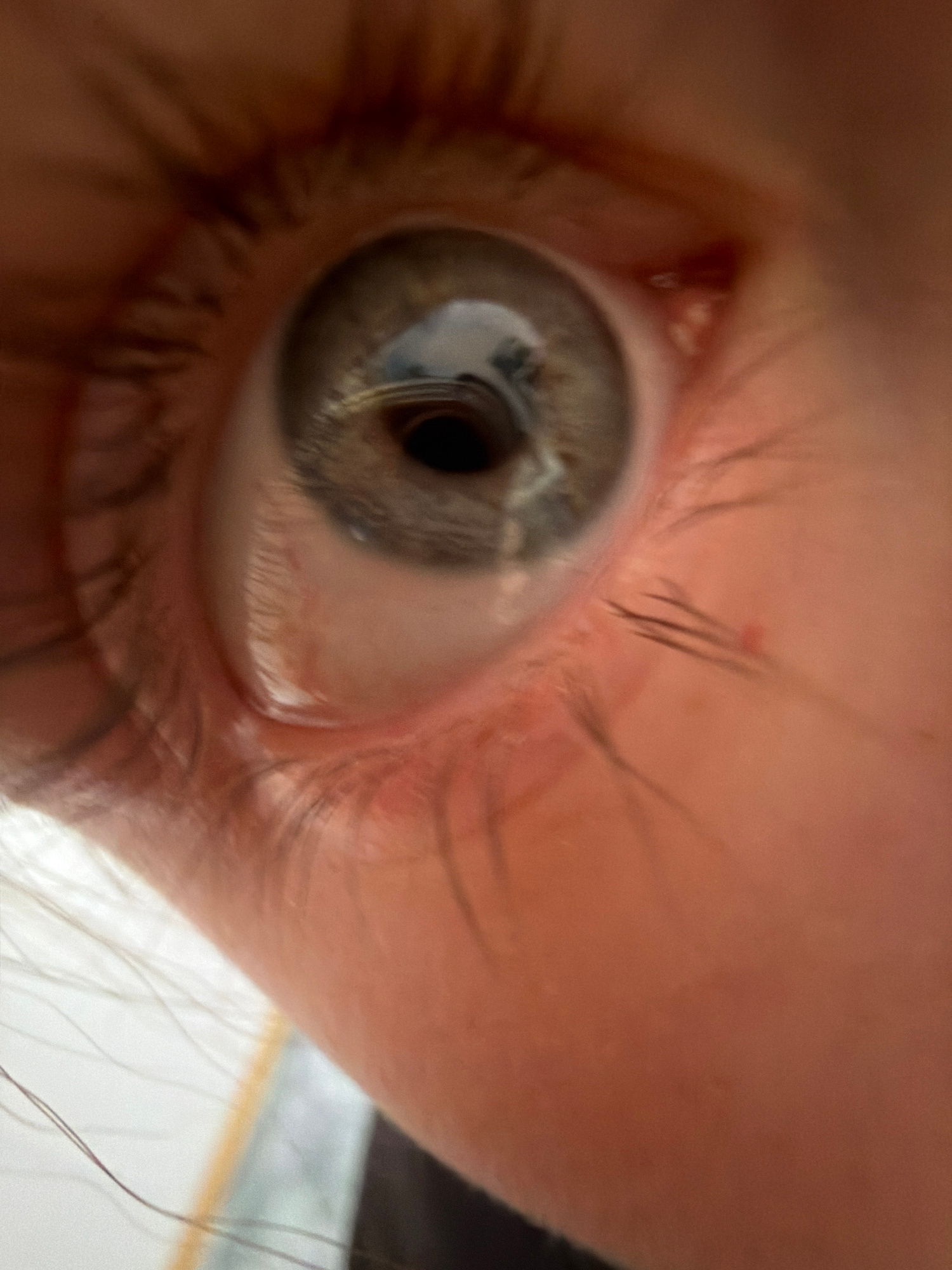 A very close-up, high-magnification photograph features a human right eye, likely belonging to a young individual given the smooth skin texture. The eye is open, with the person appearing to gaze dire…read more