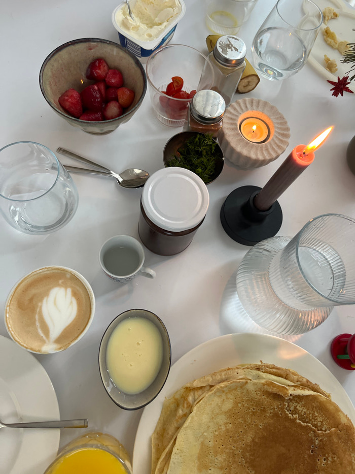 A high-angle, close-up photograph captures a breakfast or brunch spread arranged on a white table surface in the city of Gangloff, Germany. No individuals are present. The scene features an assortmen…read more