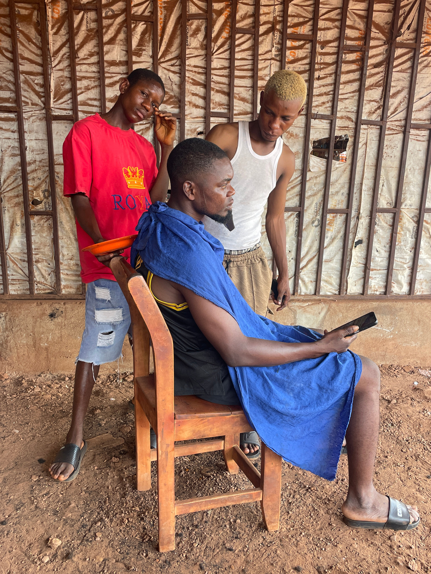 Three young Black men are gathered outdoors in a casual setting, likely in Ogbe, Nigeria. The ground is covered with reddish-brown earth and small stones. Behind them stands a makeshift wall construct…read more