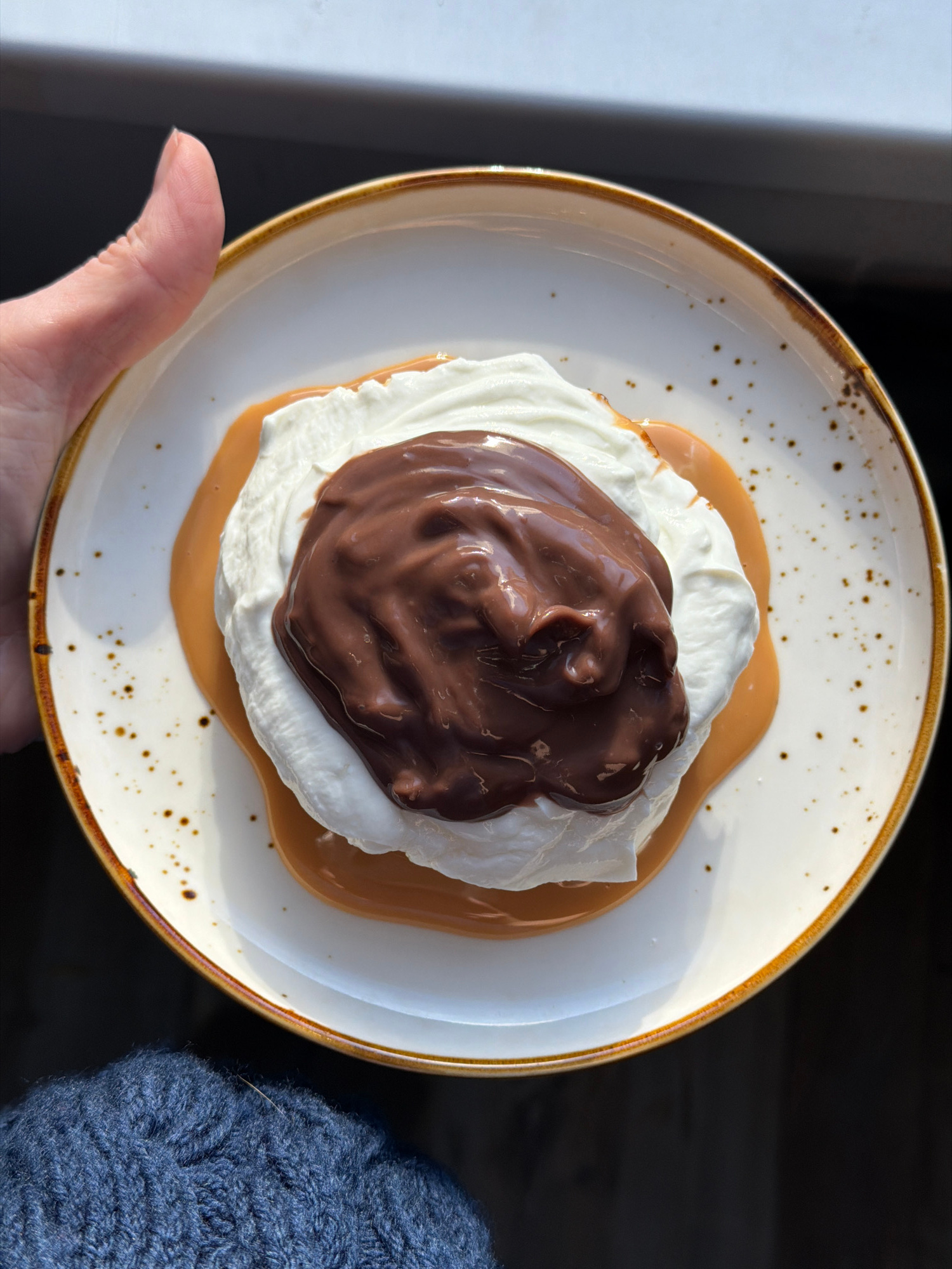 A top-down shot shows a plate of dessert held by a hand wearing a blue knitted sleeve. The dessert consists of a light brown liquid (possibly caramel) spread on the plate, topped with a dollop of whit…read more