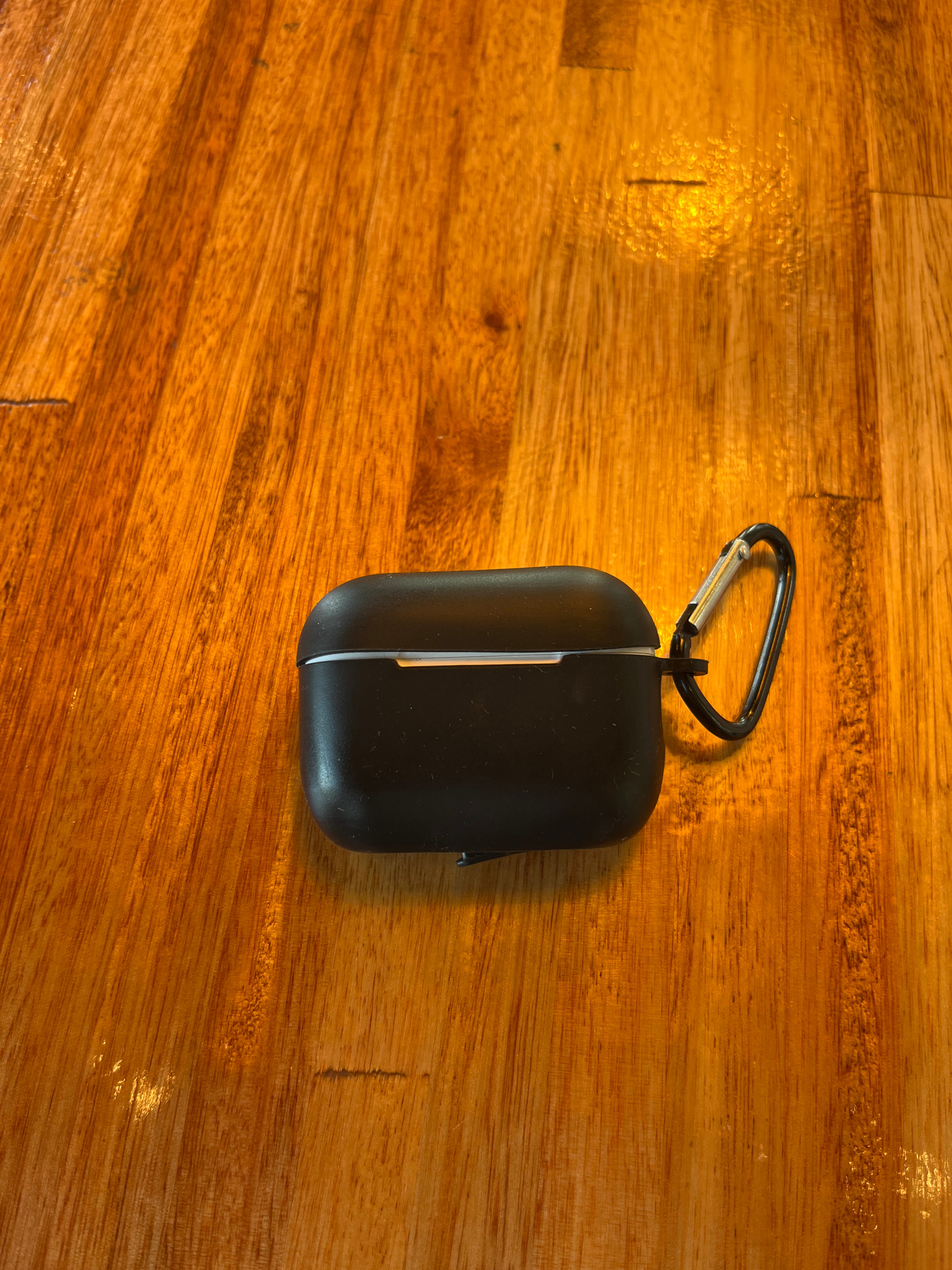 A black wireless earbud case with a metal carabiner clip attached to it is positioned on a wooden surface. The wood has a warm, golden-brown tone and a noticeable grain pattern. The case is slightly o…read more