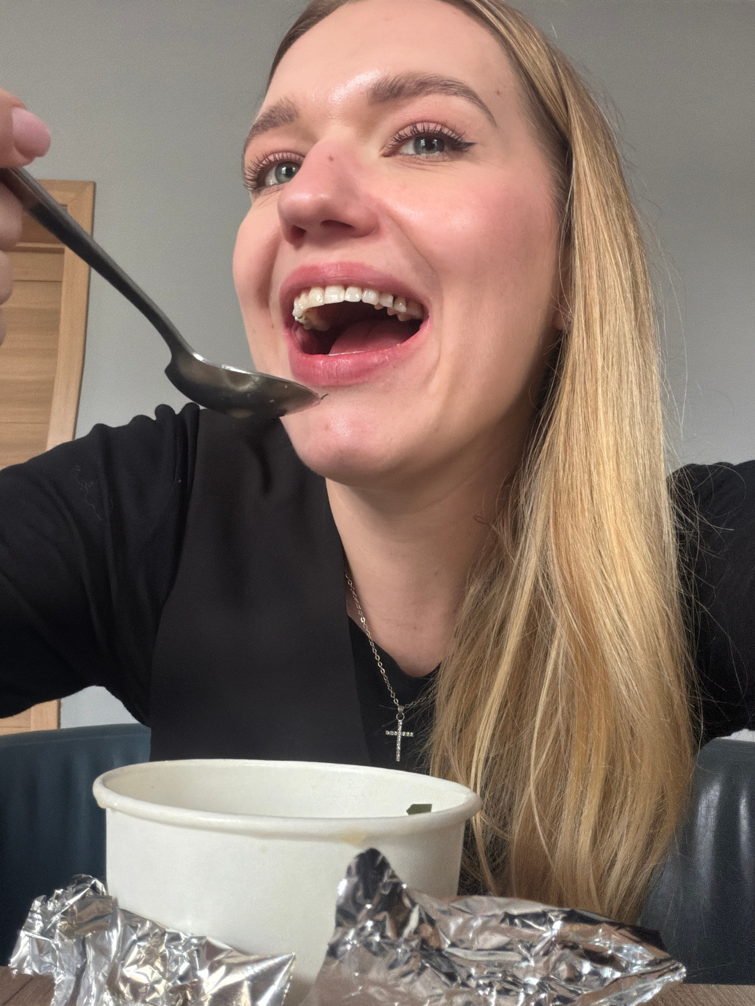 This close-up, dynamically angled image, taken in Riga, Latvia, captures a person mid-action during a meal. The subject, a woman with long blonde hair, fair skin, and light-colored eyes, is seen withβ¦read more