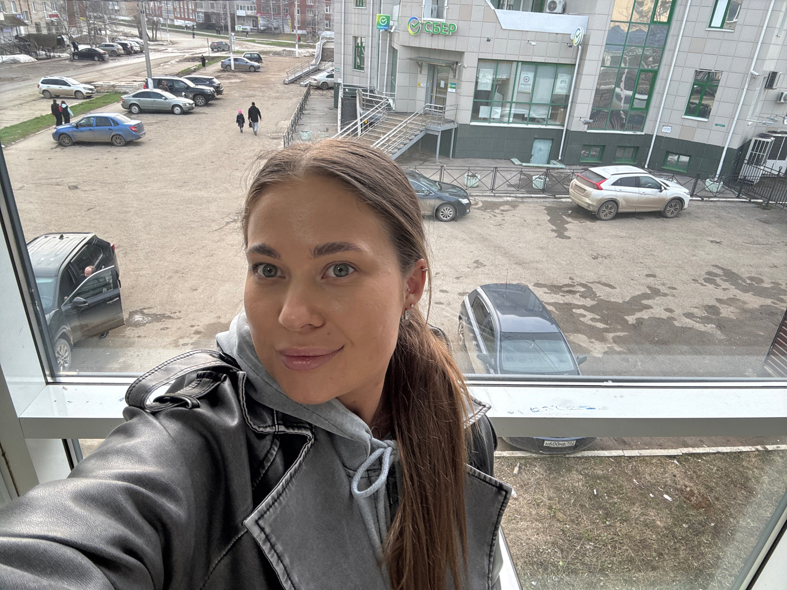 A woman, viewed upside-down, stands at a window overlooking a street scene. She is wearing a gray hoodie with a black leather jacket. Outside the window, several parked cars are visible, along with a…read more