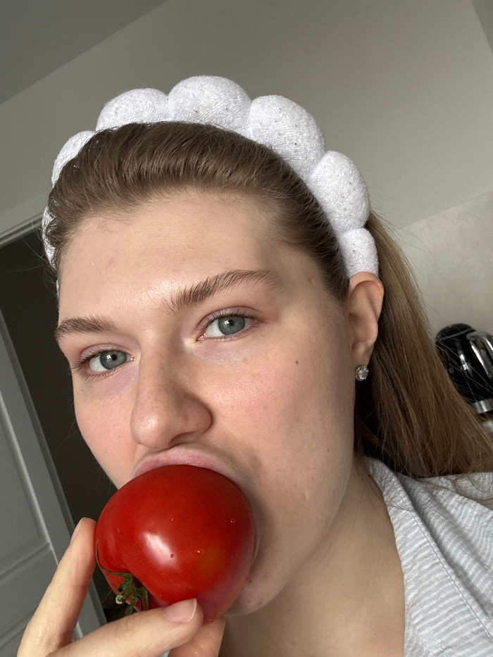 A female individual, appearing to be in an indoor setting in Kazan, Russia, is depicted in a close-up, chest-up shot. She has light skin, blue-green eyes, and brown hair pulled back, secured by a whit…read more