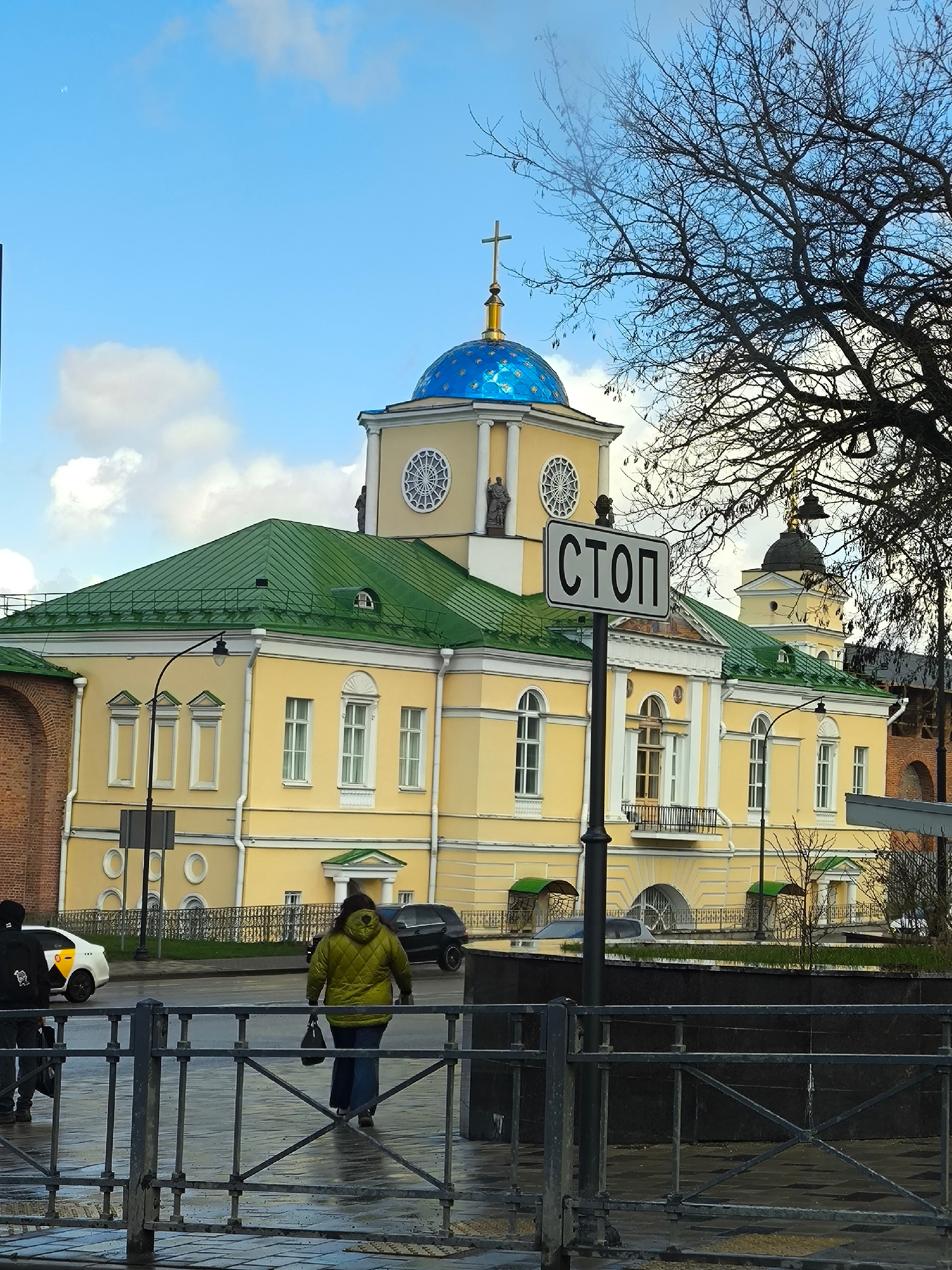 The image shows a street scene in Smolensk, Russia, with a yellow building with a green roof and a blue, onion-shaped dome topped with a cross. A "СТОП" (STOP) sign is prominently displayed in the for…read more