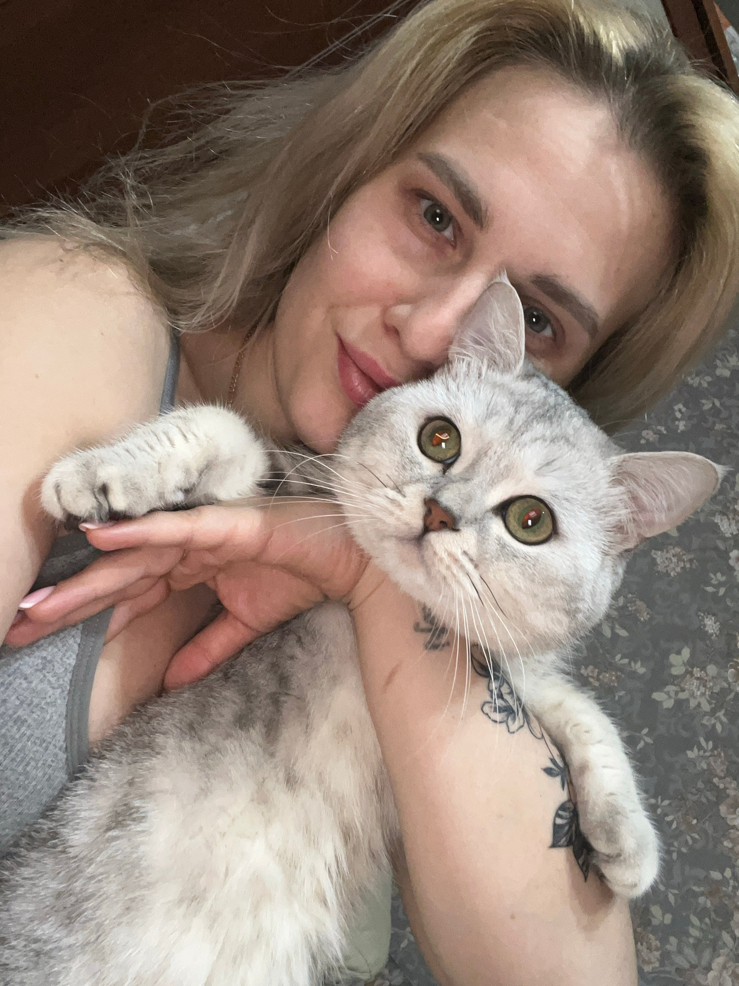 A fair-skinned woman with blonde hair is holding a gray and white cat. The woman's left arm is around the cat's neck. The cat's front left paw is in the woman's hand, and the cat's front right paw is…read more