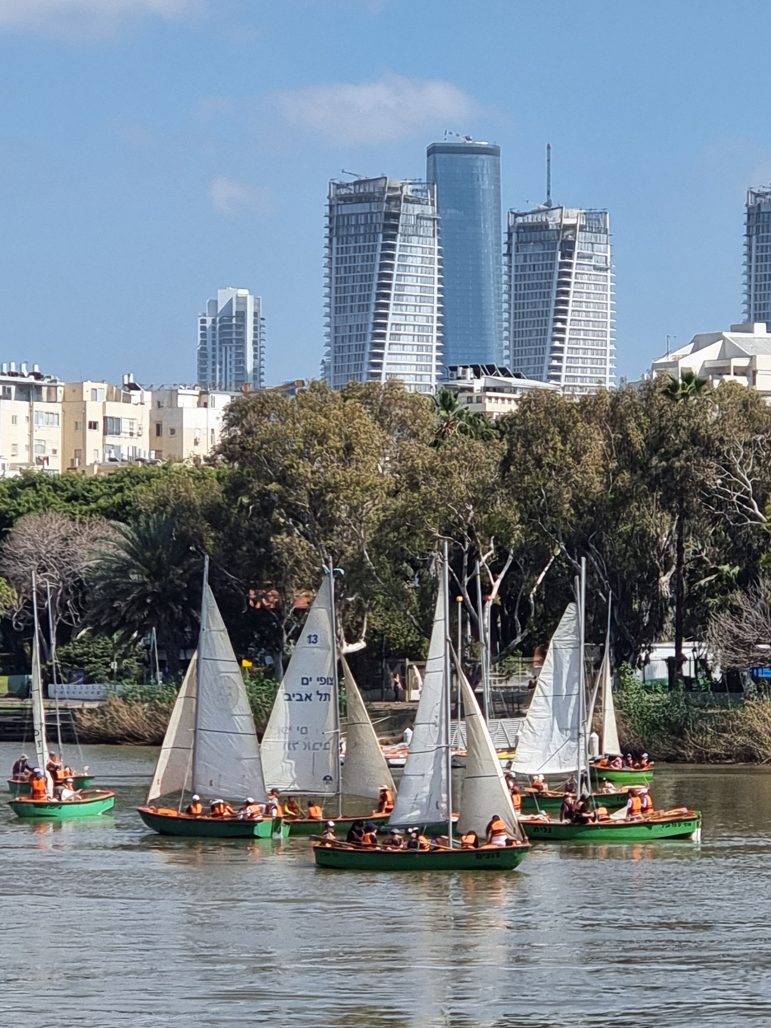 Several green sailboats with white sails are on a body of water, likely the Yarkon River, in Tel Aviv, Israel. Each boat contains several people wearing orange life vests. The boats are arranged in a…read more