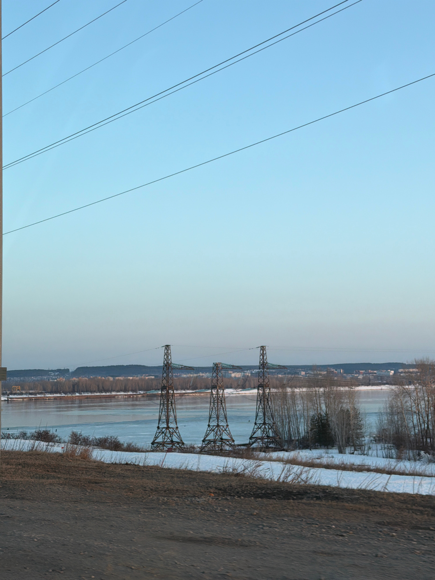 The image displays a wide landscape view in Noviy, Russia, under a clear, pale blue sky. The upper two-thirds of the frame consists of the sky, traversed diagonally by several thin, dark power lines.…read more