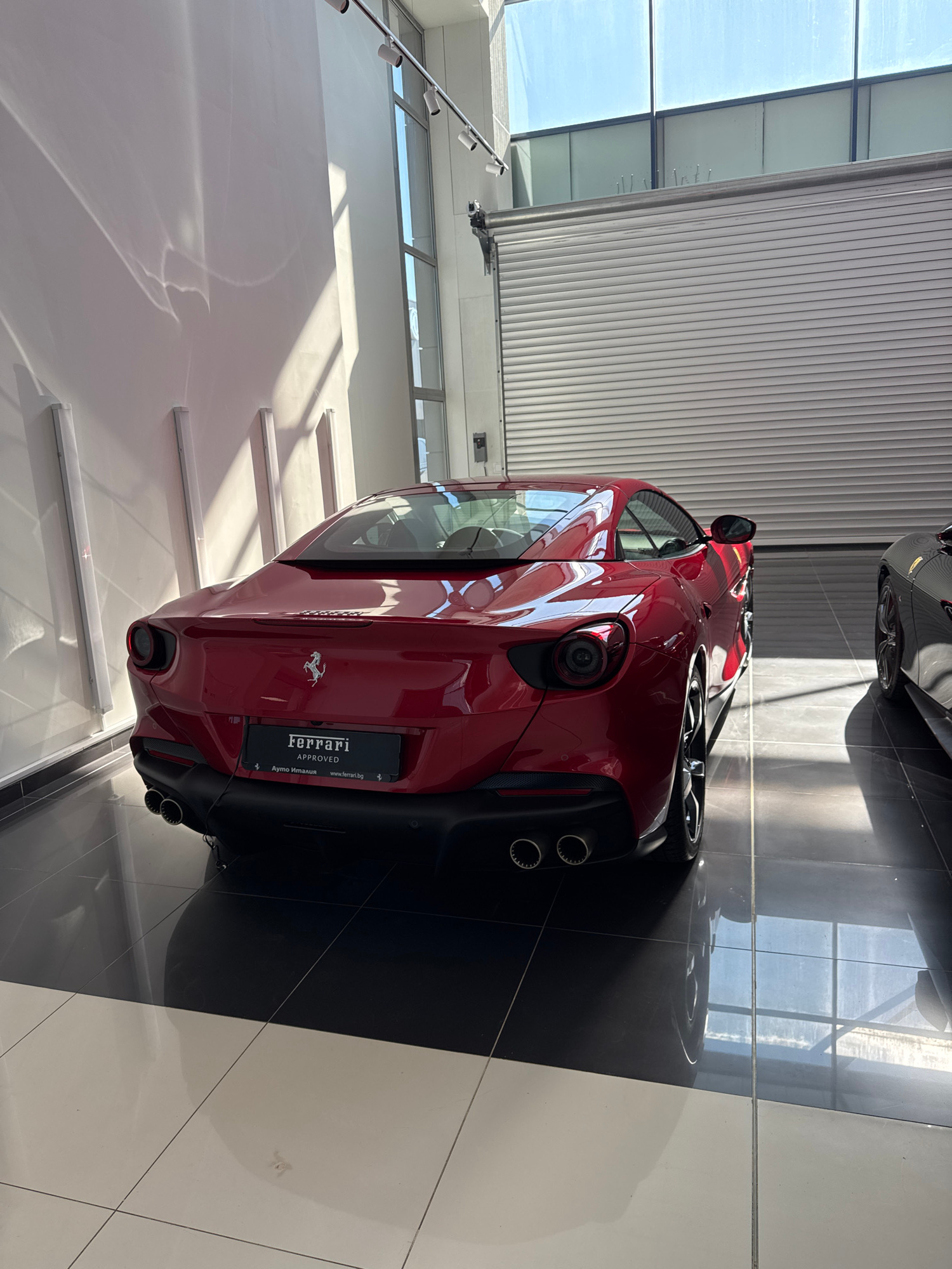 The image captures the rear of a red Ferrari parked inside a dealership showroom. The car's model is visible, bearing the "Ferrari APPROVED" badge and a Bulgarian website address ("www.ferrari.bg"), i…read more