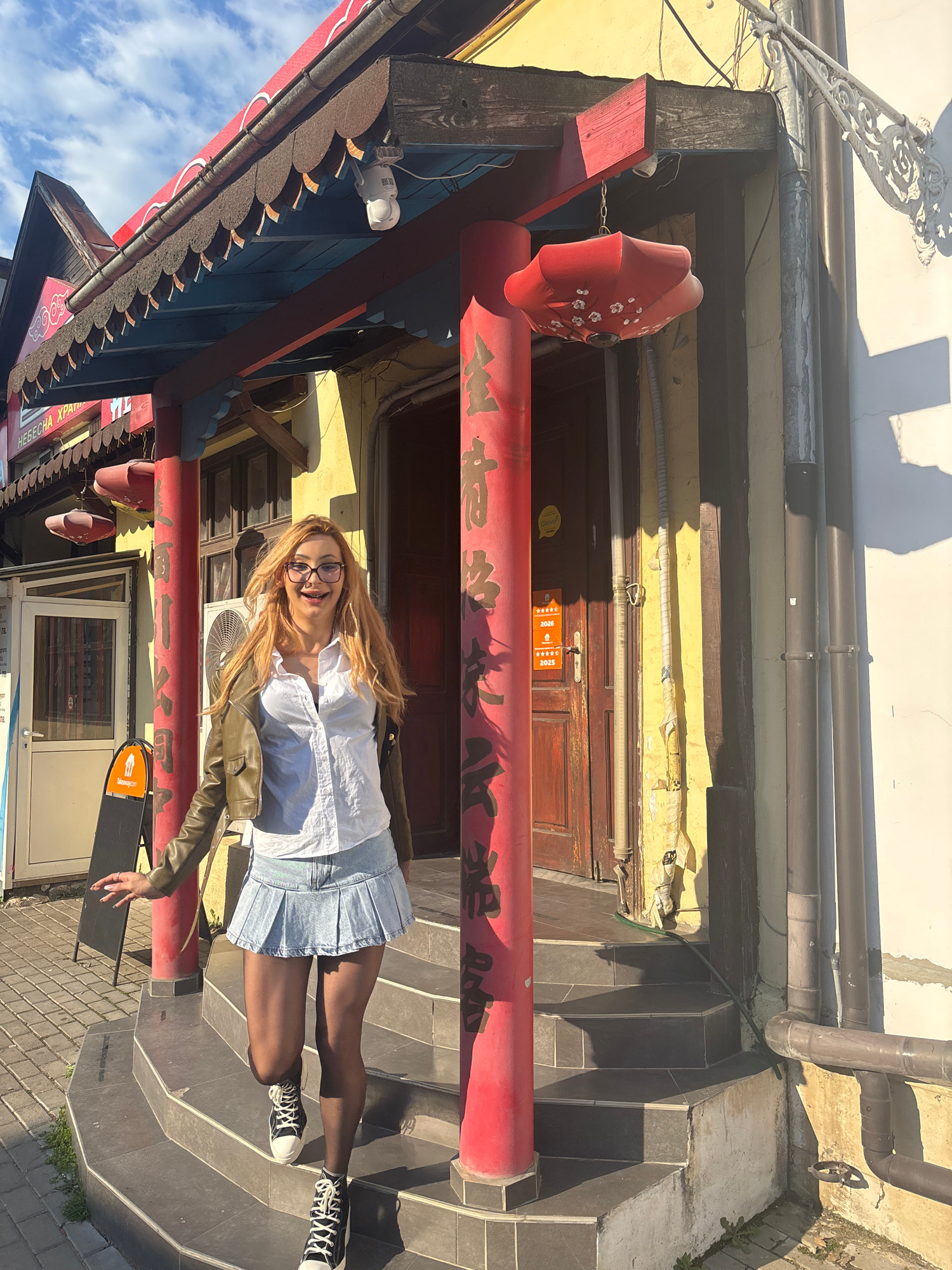 A blonde woman wearing glasses, a white blouse, a denim skirt, a green jacket, black stockings, and black and white sneakers is posing under a red Chinese archway in Varna, Bulgaria. The archway is deβ¦read more