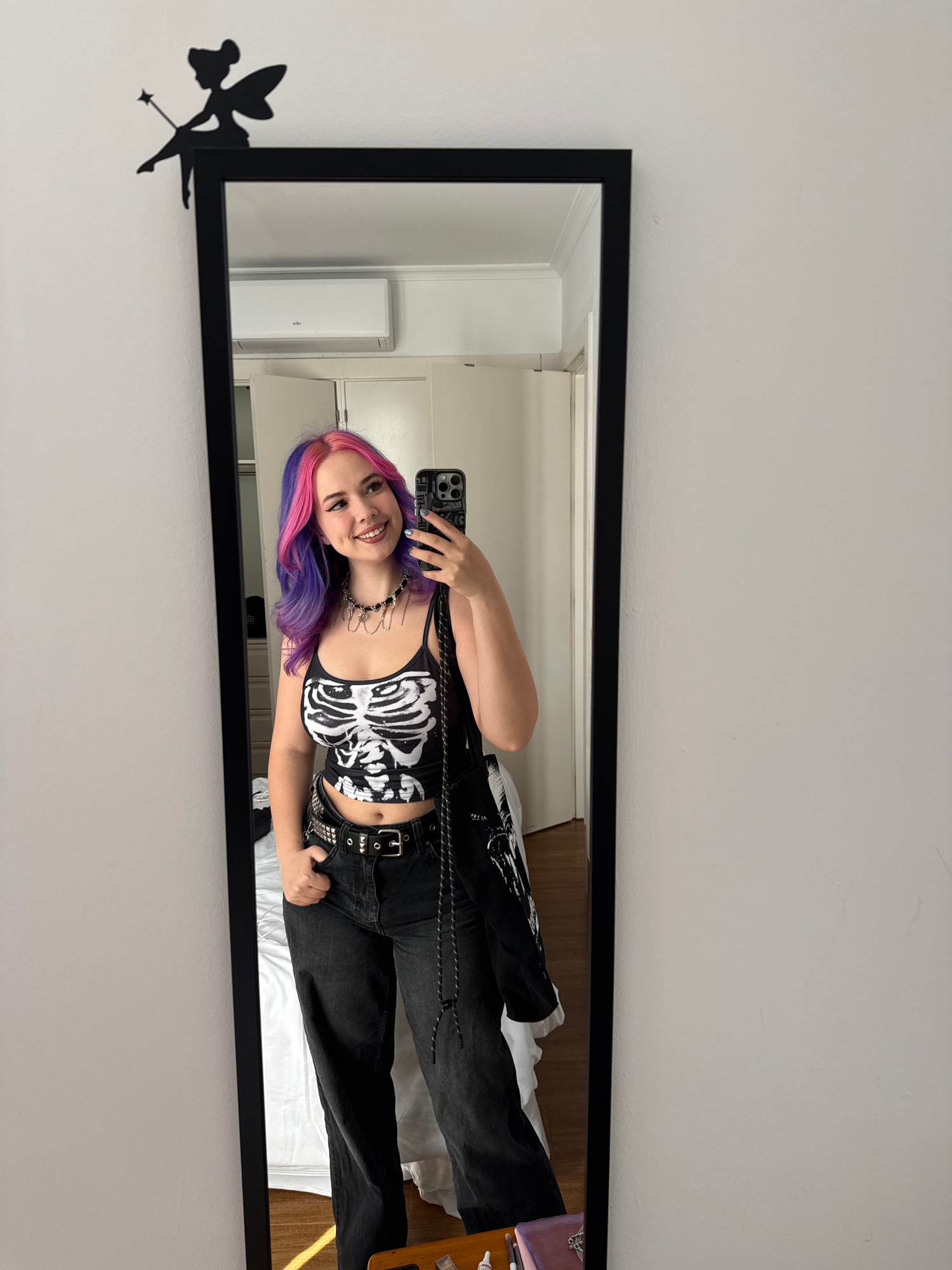 A young woman with pink and purple hair is posing for a picture in front of a full-length mirror. She is wearing a black and white skeleton-print top, black pants with a studded belt, and a chain neck…read more