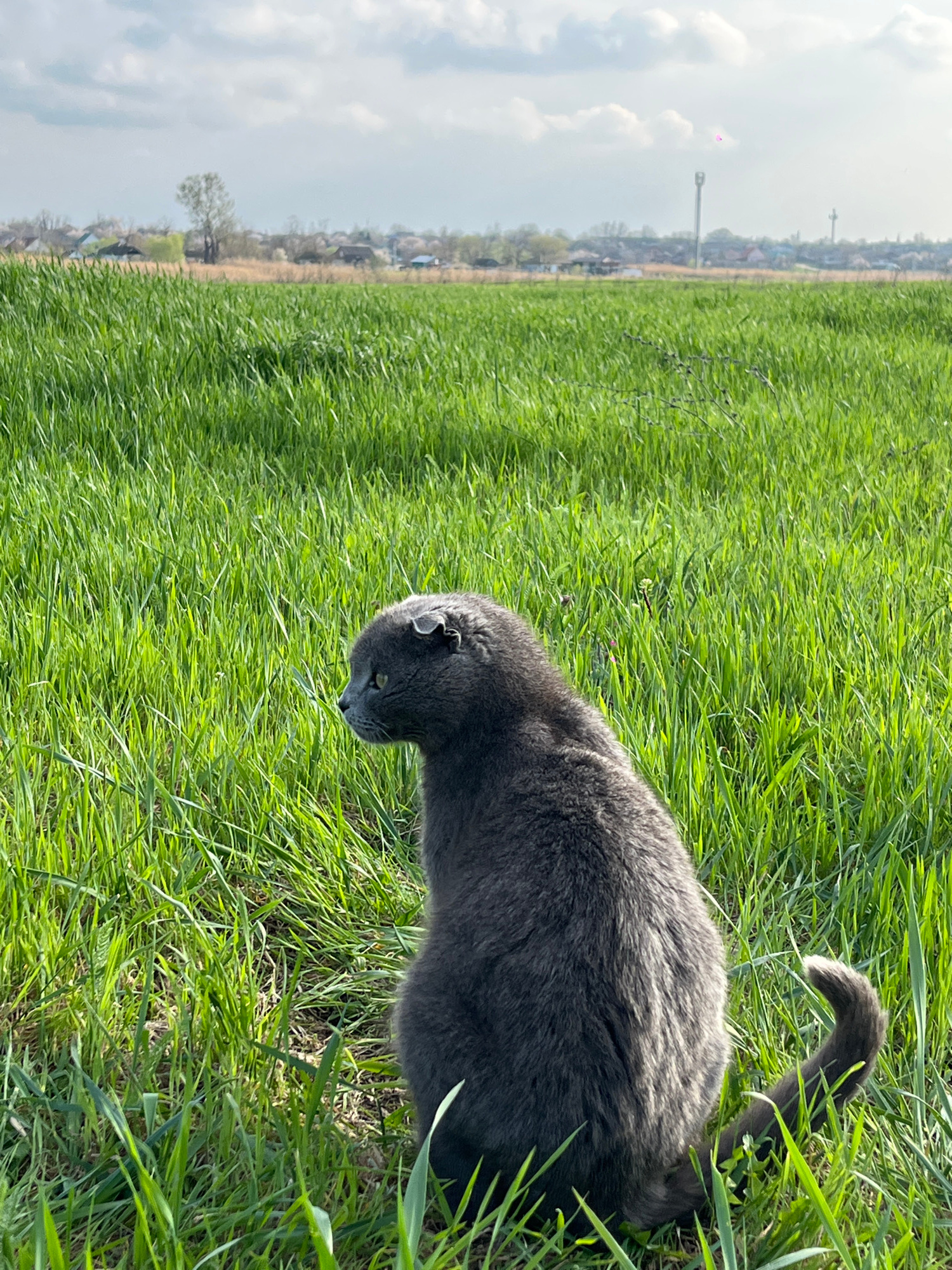 A gray cat is in a field of bright green grass. The background shows a townscape with a light gray sky above it. The town is identified as Novopokrovskaya, Russia. A light pole is visible in the backg…read more