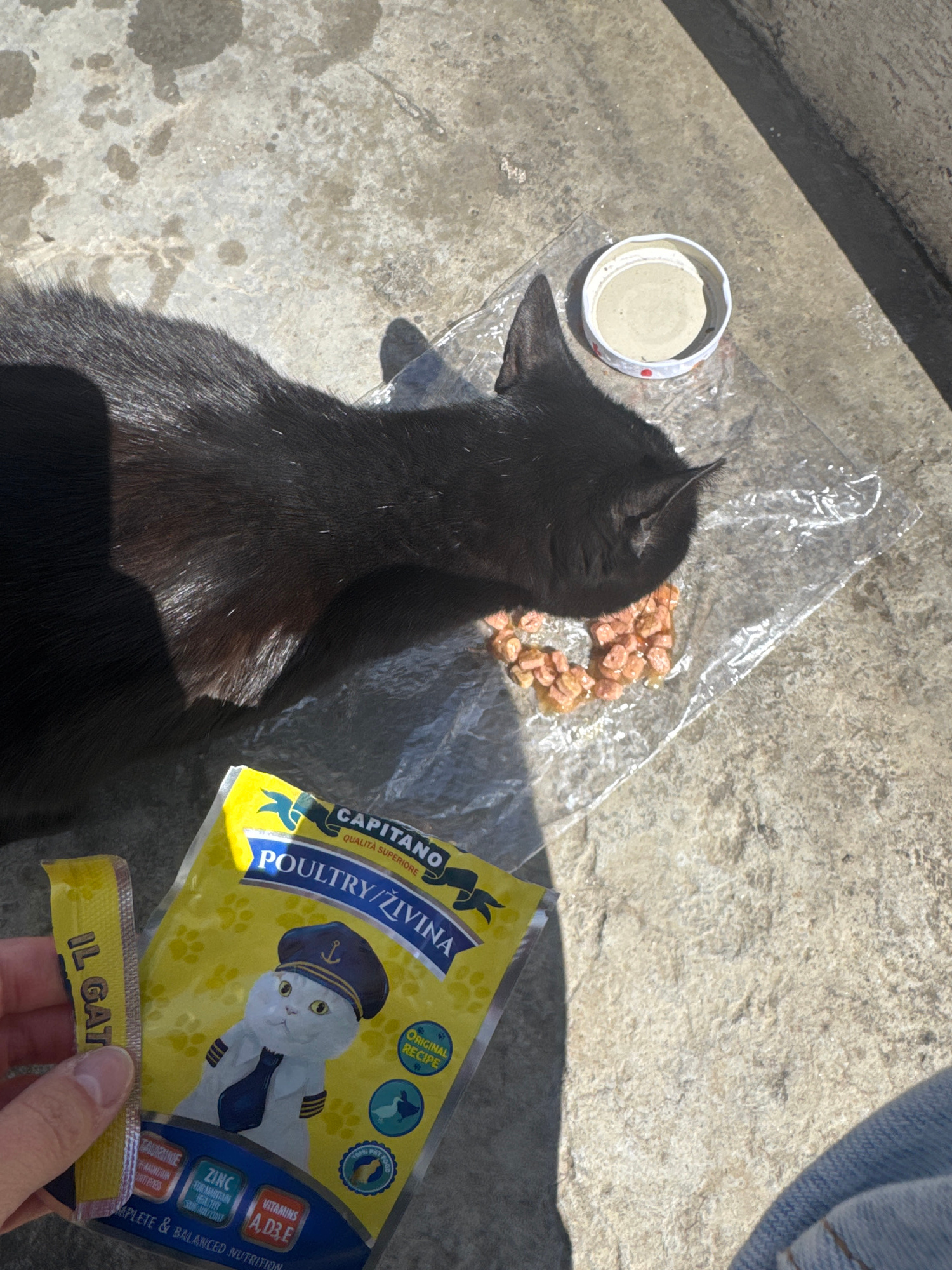 The image, likely taken in Bjeliši, Montenegro, features a black cat positioned among various items related to cat food. A bowl of wet cat food sits to the left, and a clear plastic bag holds a portio…read more