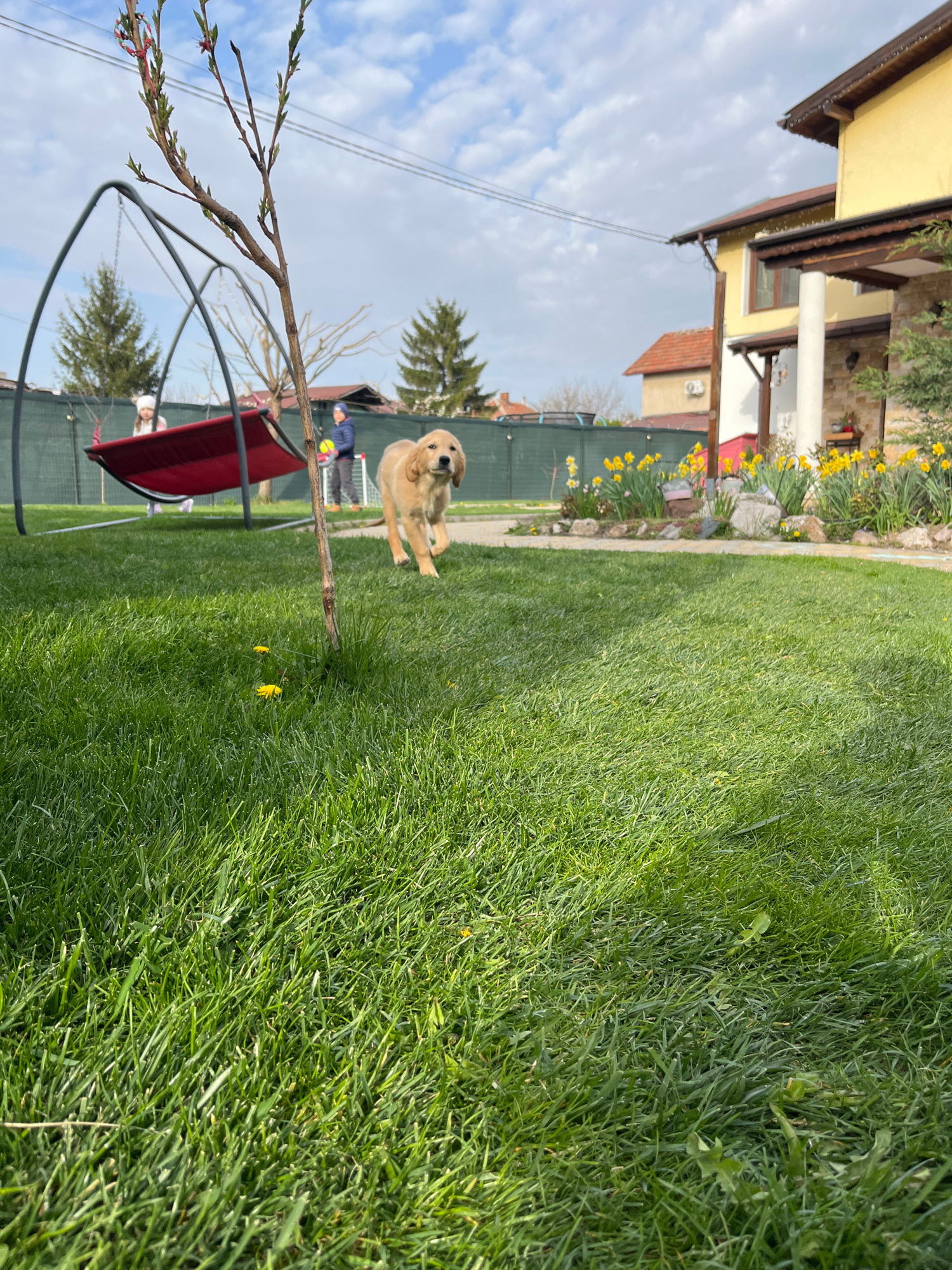 The image shows a dog running across a grassy lawn in Kostinbrod, Bulgaria. In the background, there is a house with yellow and white walls, a red roof, and a stone-lined flower bed containing daffodi…read more
