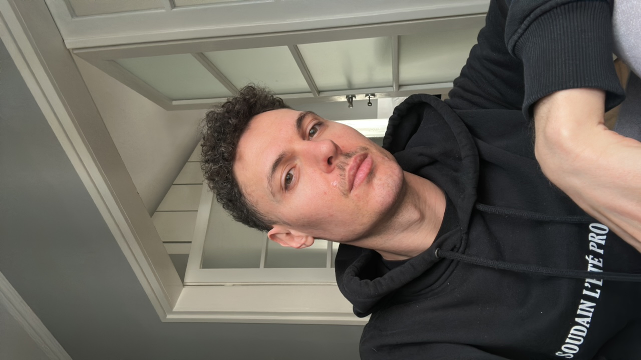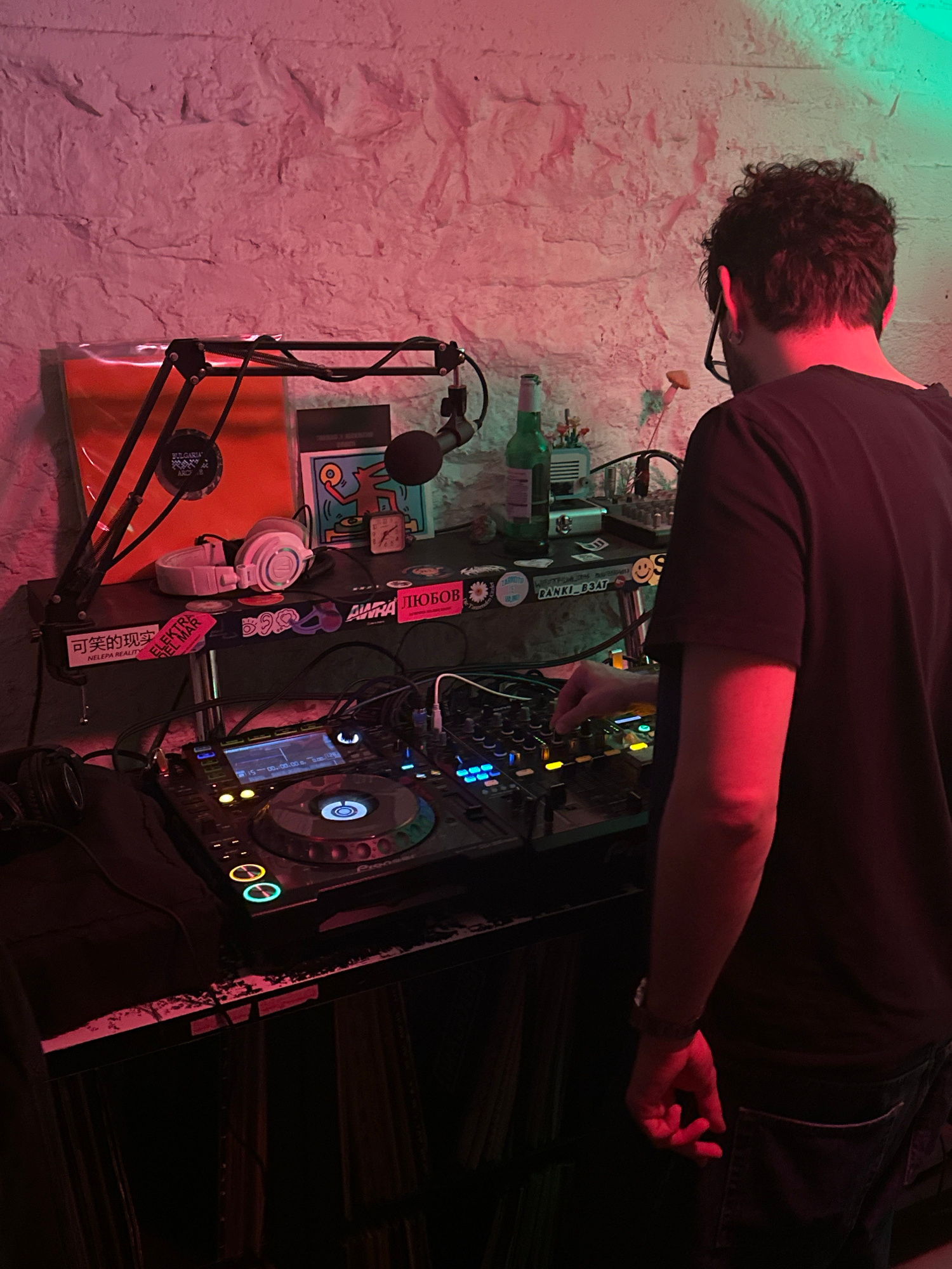 A DJ with dark curly hair, wearing a black T-shirt and jeans, stands at a DJ console adjusting the controls with his right hand. The console is adorned with multiple stickers, including Bulgarian text…read more