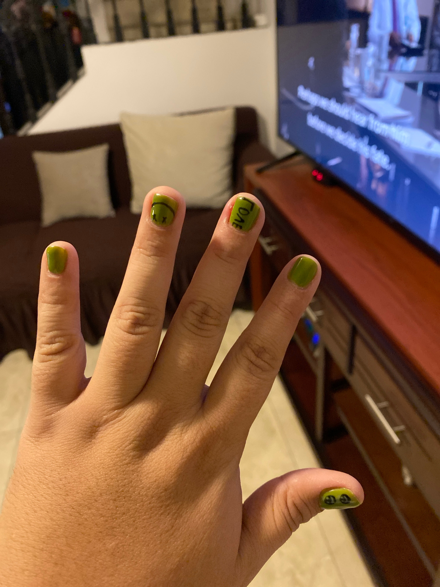 A hand with green nail polish and black designs is displayed in an interior setting. The thumb has two black circles, the index finger has "ГОЛБ" written on it, and the middle finger has a black smile…read more