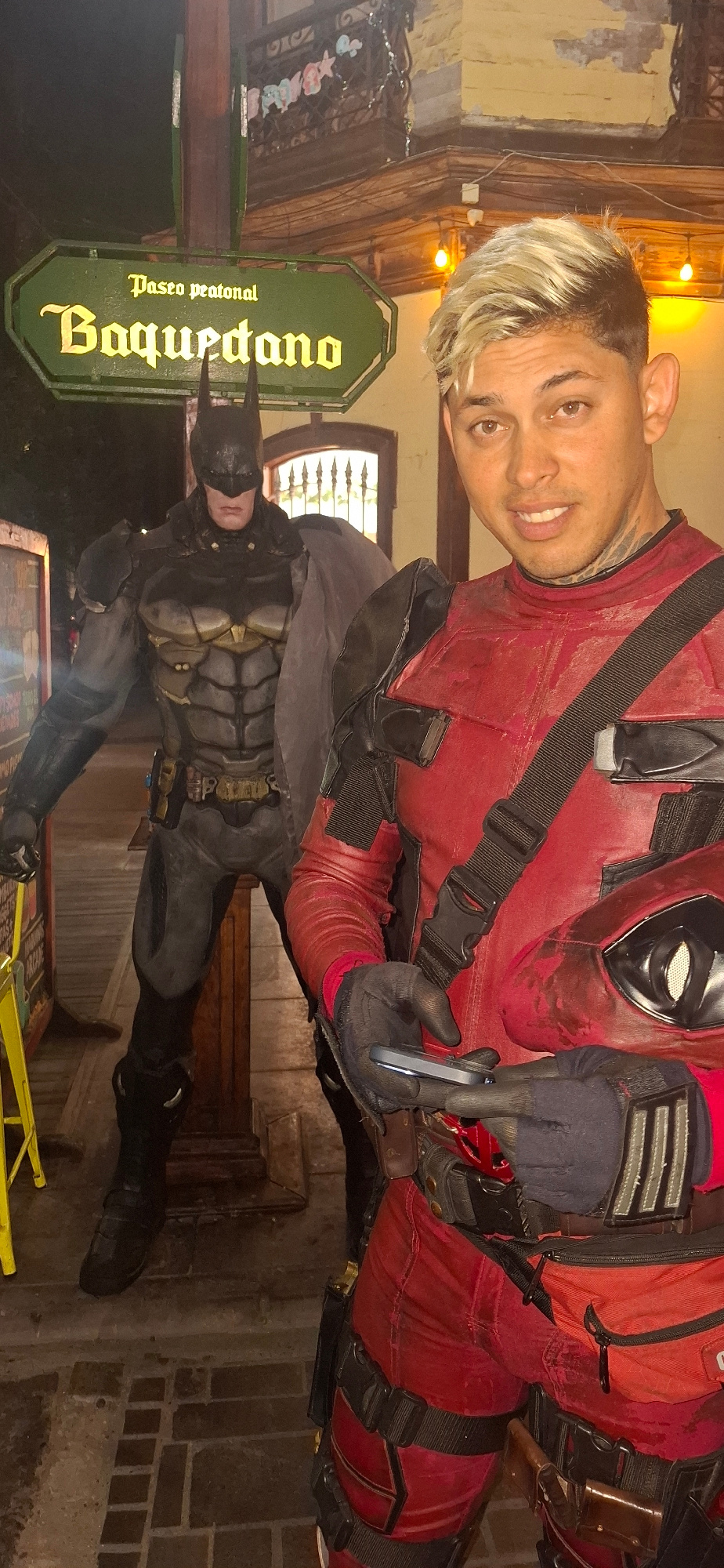 In Iquique, Chile, a man with bleached blonde hair smiles and angles his face towards the camera. He is dressed in a worn red Deadpool costume, complete with gloves, pouches, and a black harness acros…read more