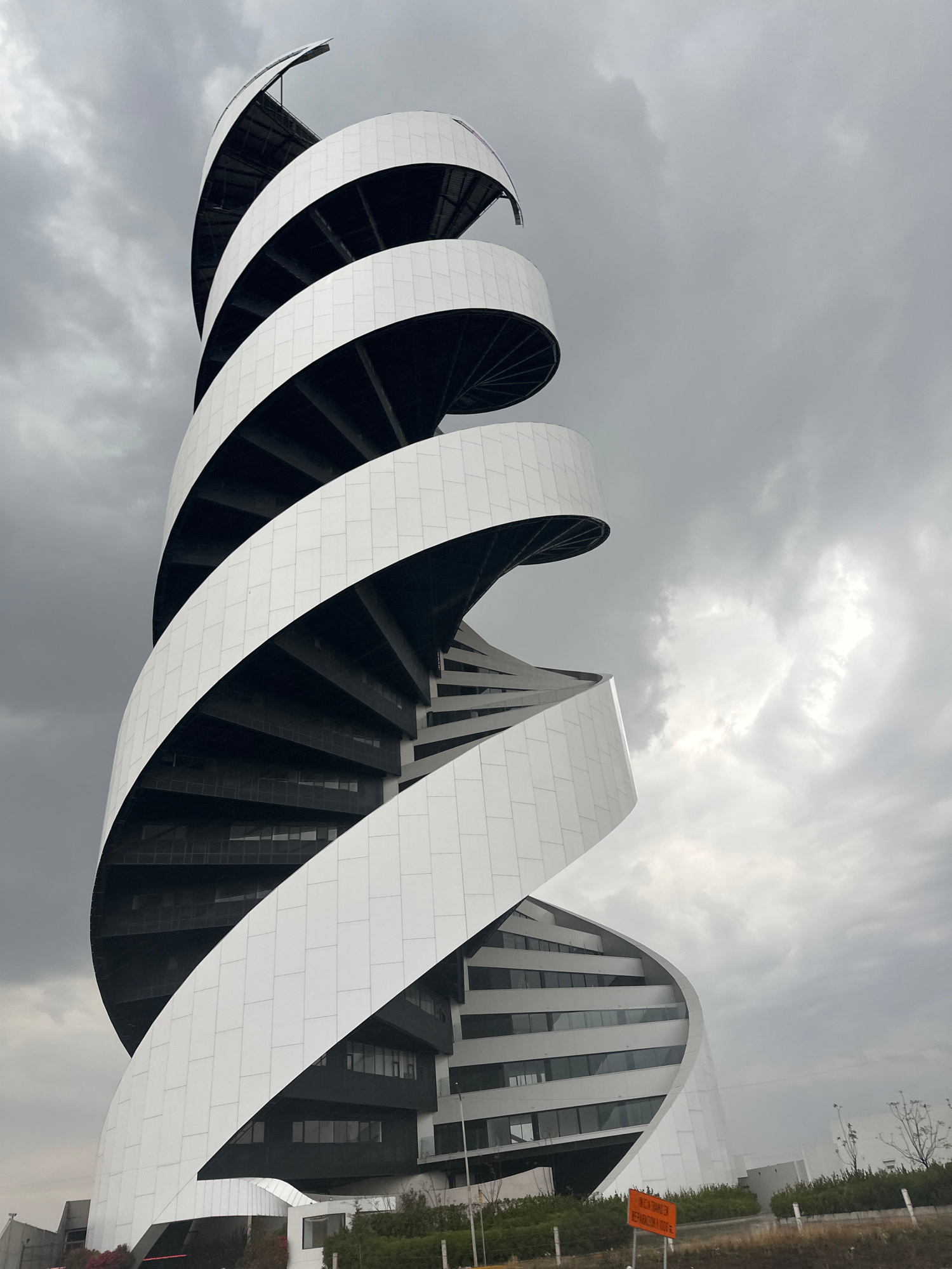 The image depicts a modern architectural structure in San Bernardino Tlaxcalancingo, Mexico, under a cloudy sky. The building features a spiral design with alternating white and black sections, creati…read more