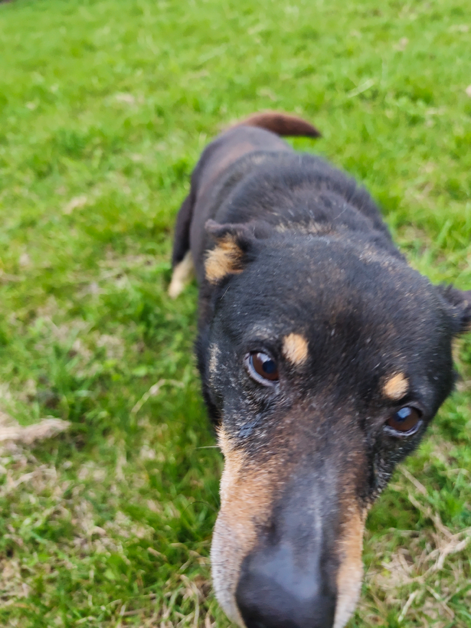 A close-up shot shows a black and brown dog with a short tail standing on green grass. The dog's face is the main focus, with its nose and eyes prominently displayed. The background consists of a lawn…read more