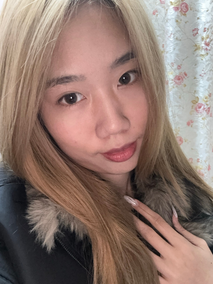 A female individual is depicted in a close-up, chest-up portrait format, captured indoors in Shapingba District, China. She has fair skin, dark brown eyes, and long, straight, light brown hair. Her li…read more