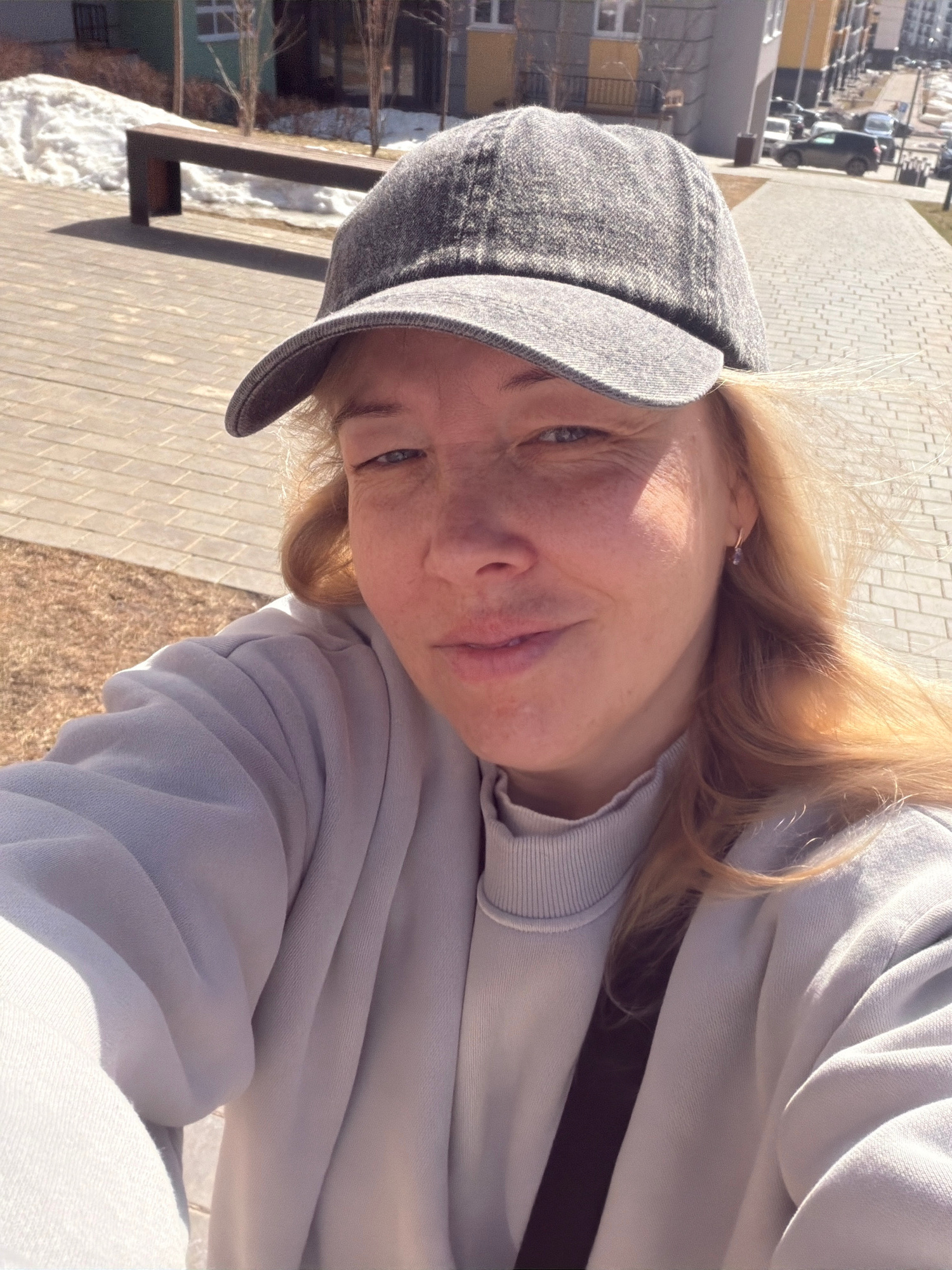 A person wearing a gray denim cap and a light gray sweatshirt is facing the camera. The individual has blonde hair and fair skin with visible freckles. The background includes a paved walkway of recta…read more