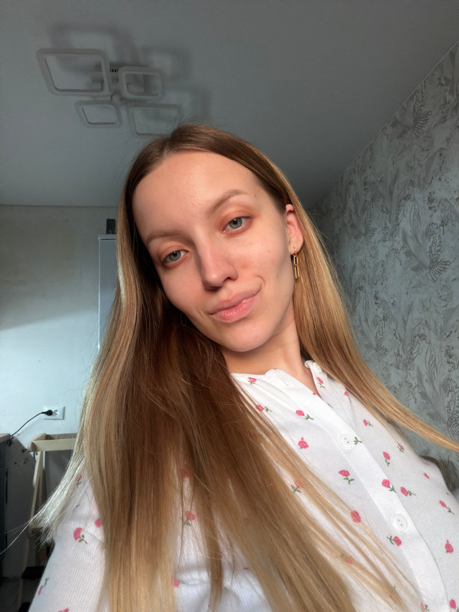 A woman with long blonde hair is posing for a selfie. She is wearing a white shirt with small red floral patterns. Her hair is partially covering her face and shirt. She is wearing a gold earring. The…read more