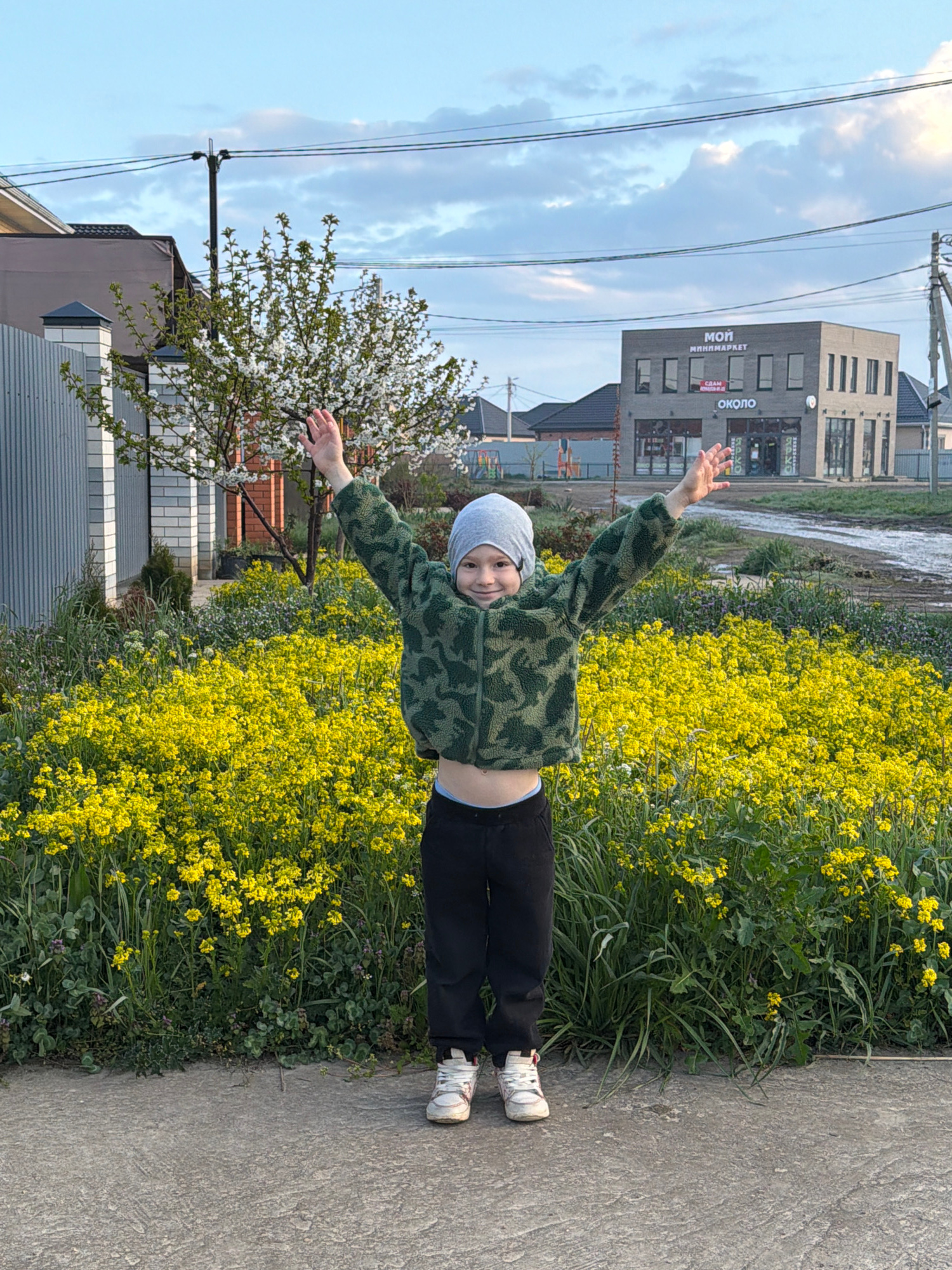 A child wearing a gray beanie, a green camouflage jacket, black pants, and white sneakers is standing on a concrete walkway in Rossiyskiy, Russia. The child has their arms outstretched. To the right o…read more