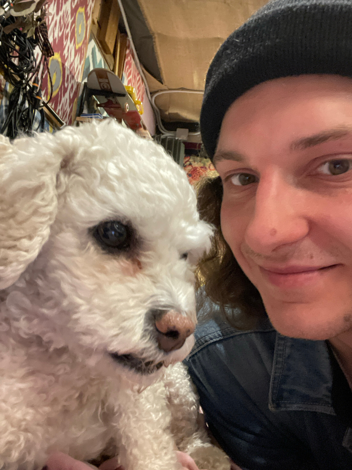 A close-up selfie shows a person wearing a dark beanie and a denim jacket, smiling slightly at the camera. A white, fluffy dog with dark eyes and a brown nose is positioned below the person's face, lo…read more
