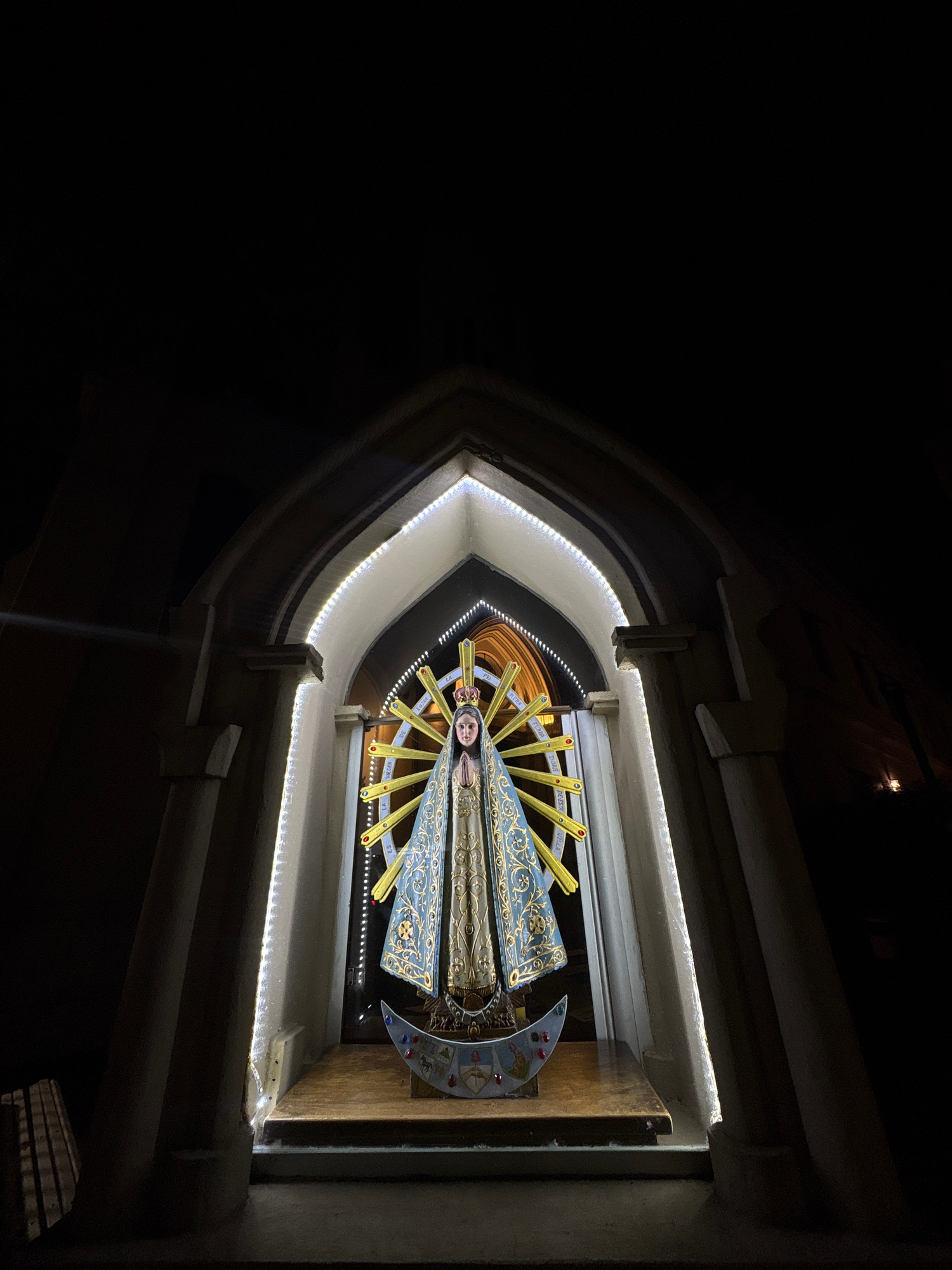 A statue of the Virgin Mary in a lighted niche, possibly outdoors, with LED lighting around the niche edges. The statue is adorned with ornate robes and surrounded by golden rays. The location is like…read more