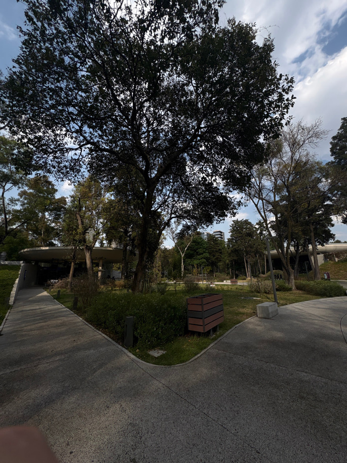 A sprawling tree with dense, dark foliage dominates the view, contrasting with a brighter sky dappled with clouds. A winding concrete path edges a grassy area with several trees and vegetation. A brow…read more
