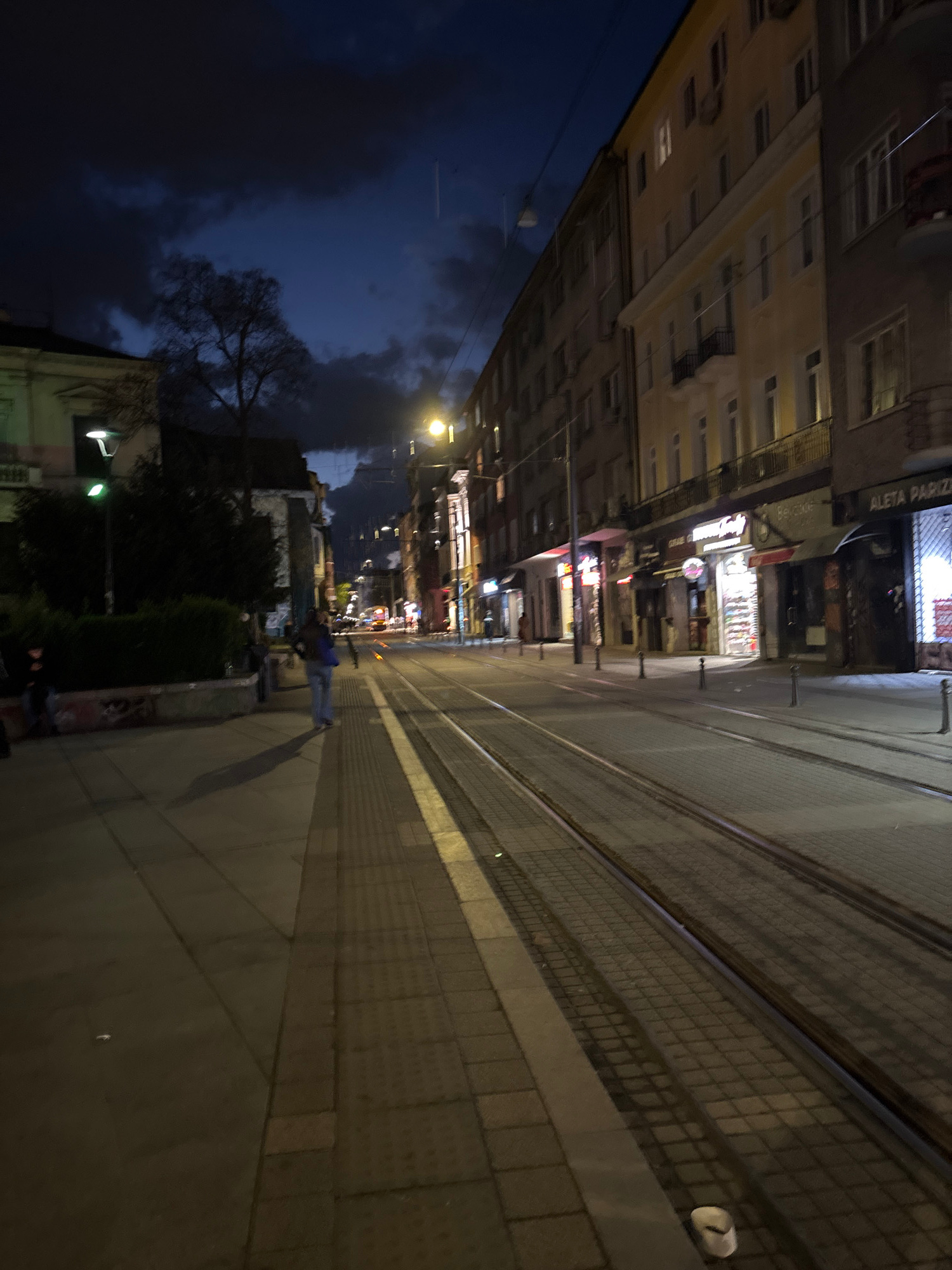 The image depicts a street scene at night in Sofia, Bulgaria. The perspective is elongated. Along the left edge, tall buildings with multiple stories and windows are visible, some illuminated by stree…read more